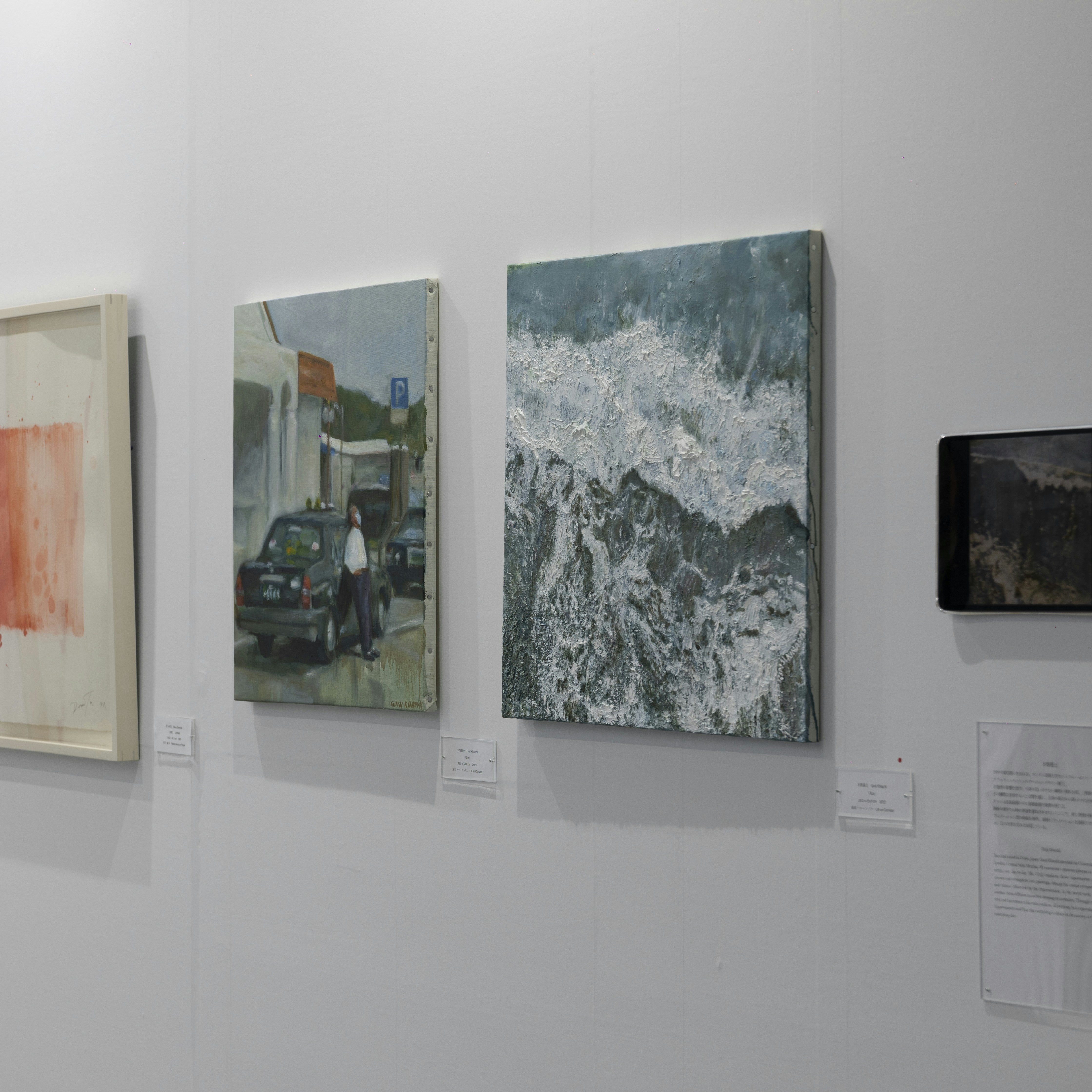 林 木梨さんは、波を描いた油彩作品を展示したのですが、海岸にやってきた波をまず描き、そのうえに波が引く様子や次の波がやってくる様子を重ねて描いています。パラパラ漫画を1枚の画面に重ねて描いたような方法です。画面に見えているのは最後の波のシーンですが、その前の波もさらにその前の波も実際には描かれていて、厚みを持った画面にアニメーションの時間的な堆積が閉じ込められています。そのコンセプトが面白いと思いましたし、いまの自分がいるのは過去があったからだという人生の象徴のようでもありますし、美術史の流れがあったことで、いまの若手の表現が生まれたのだということも表現できる作品だと感じました。
