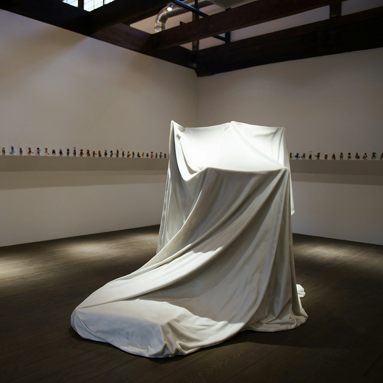 中央の立体は、私の子供たちが椅子やクッションを組み合わせて、上に布を置いてプレイハウスにして遊んでいたのですが、それを写真に撮って、大理石で彫刻作品にしたものです。周りの作品は、やはり子供たちのプレイモービルを用いた作品です。社会のルールを教育するためなのか、カウボーイや看護師、農家などの職業がわかりやすく表現されていて、男女も明確に見て取れるおもちゃなのですが、子供たちはバラバラにして組み立て直して遊んでいました。職業もジェンダーもごちゃ混ぜにした状態です。それは人々の望みではないでしょうか。レッテルを貼られて分類されることは誰も望んでいないでしょう。そんなことを子供たちと遊びながら考えていました。