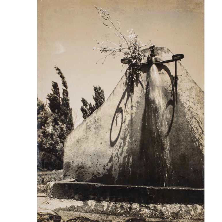 1930年代に安井は「半静物」という独自の表現方法を編み出します。撮影する場所にある静物を組み変える手法です。《公園》は、水道から水が出ている場面を写したものです。安井はそのままでは面白くないということで、近くで草を摘んできて、水道の横に差して撮影しています。