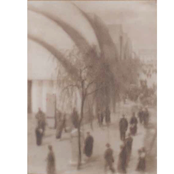 1920年代当時、「芸術写真」と総称される絵画に近い風合いをもたせた写真が流行でした。当時の安井も様々な技法を駆使してこうした傾向の作品を制作しています。《分離派の建築と其周囲》は、安井が第一次世界大戦終結を記念して東京の上野公園で開催された平和記念東京博覧会を訪れたときの写真です。背後にあるアーチが印象的な建物は堀口捨己が設計した分離派建築のパビリオンです。当初の安井はこの作品のように安定した構図で絵をつくり込んでいるのですが、だんだんと動きが出てきます。