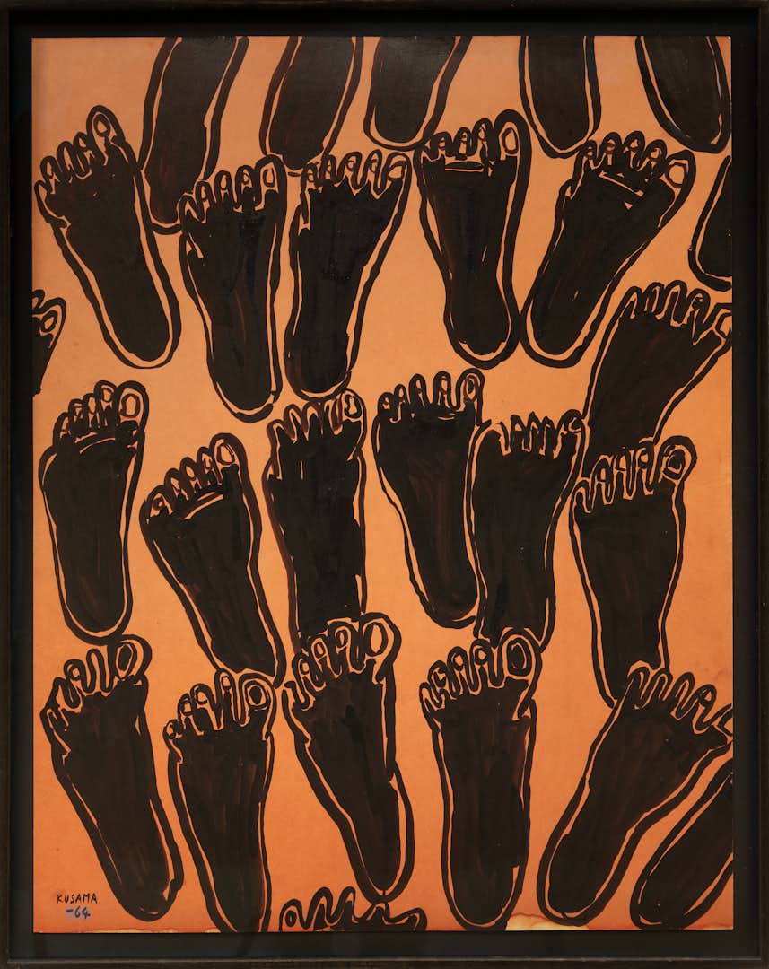 展示された最初の作品《無限の網(DHPP)》と次の《ドッツ》は、それぞれ2010年と1990年に描かれているが、シリーズとしてはどちらも60年代から続いているものだ。網状の形態またはドットが、キャンバスいっぱいに描かれ、それらが無限に広がっていくような感覚に陥る。吉田は草間作品の強度について次のように評した。「小さい頃から見えていた幻覚と向き合い、描き続けてきたシリーズなのですね。草間さんはいつも、自身の存在と作品が不可分なものとしてあるように思えます。作品が生まれる必然性みたいなものが確かにある。そこから作品の強さや吸引力が生じているように感じられます」。同じ壁面に掛けられている《無題(足)》(1964)は、草間作品のモチーフとしては珍しく、身体の一部が描かれている。「なぜか左足ばかりを描いていますね。ひょっとすると、前に投げ出したご自身の足を、見ながら写したものなのでしょうか」。