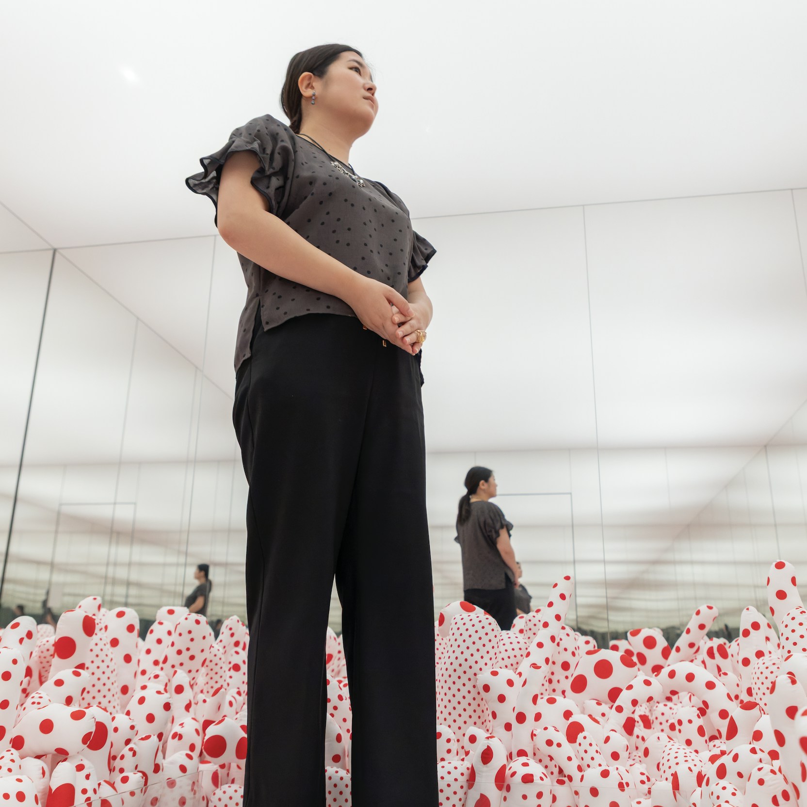 草間彌生「INFINITY - SELECTED WORKS FROM THE COLLECTION」展が開かれているエスパ ス ルイ・ヴィトン大阪を、NHK連続テレビ小説『虎に翼』やドラマ『恋せぬふたり』などで知 られる脚本家・小説家の吉田恵里香が訪問。稀代のストーリーメーカーの目に、草間彌生作品 はどう映ったのか。