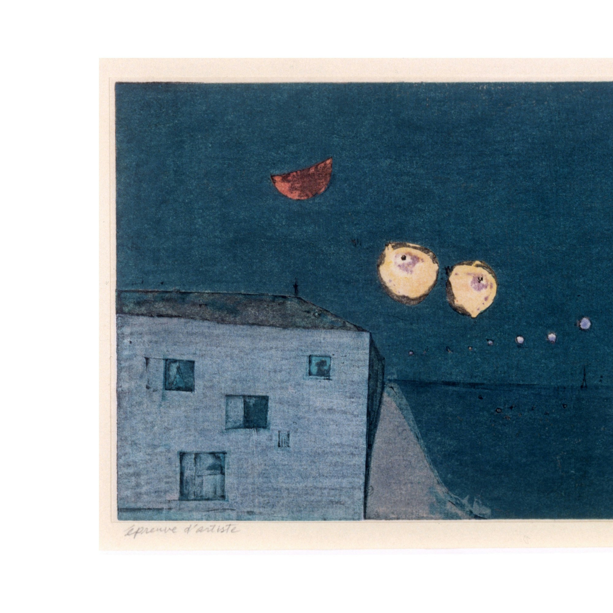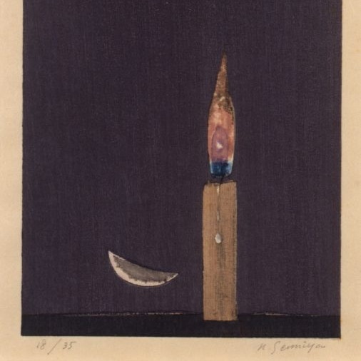 油性のインクではなく透明水彩を用い、摺りごとに微妙に色調を変えることで、詩情あふれる作品を生み出した清宮。版による複製性よりも、「彫り」の線や「摺り」による色の重なりといった版画ならではのイメージのなかに表現の可能性を追求し、1枚あるいは数枚しか摺られなかった作品も多い。