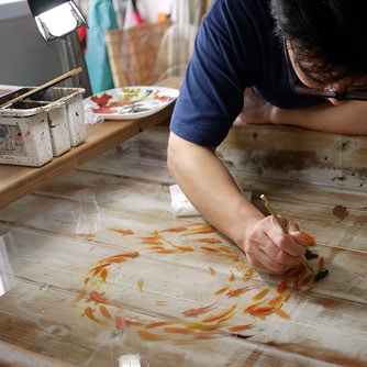 極めて独創的な技法を用いて金魚を描く深堀。器の中に樹脂を流し込み。その表面にアクリル絵の具で金魚を少しずつ部分的に描いていき、更にその上から樹脂を重ねる。この作業を繰り返すことにより、絵が重なり合い、まるで生きているかのような立体感を持つ金魚が表現されるという。