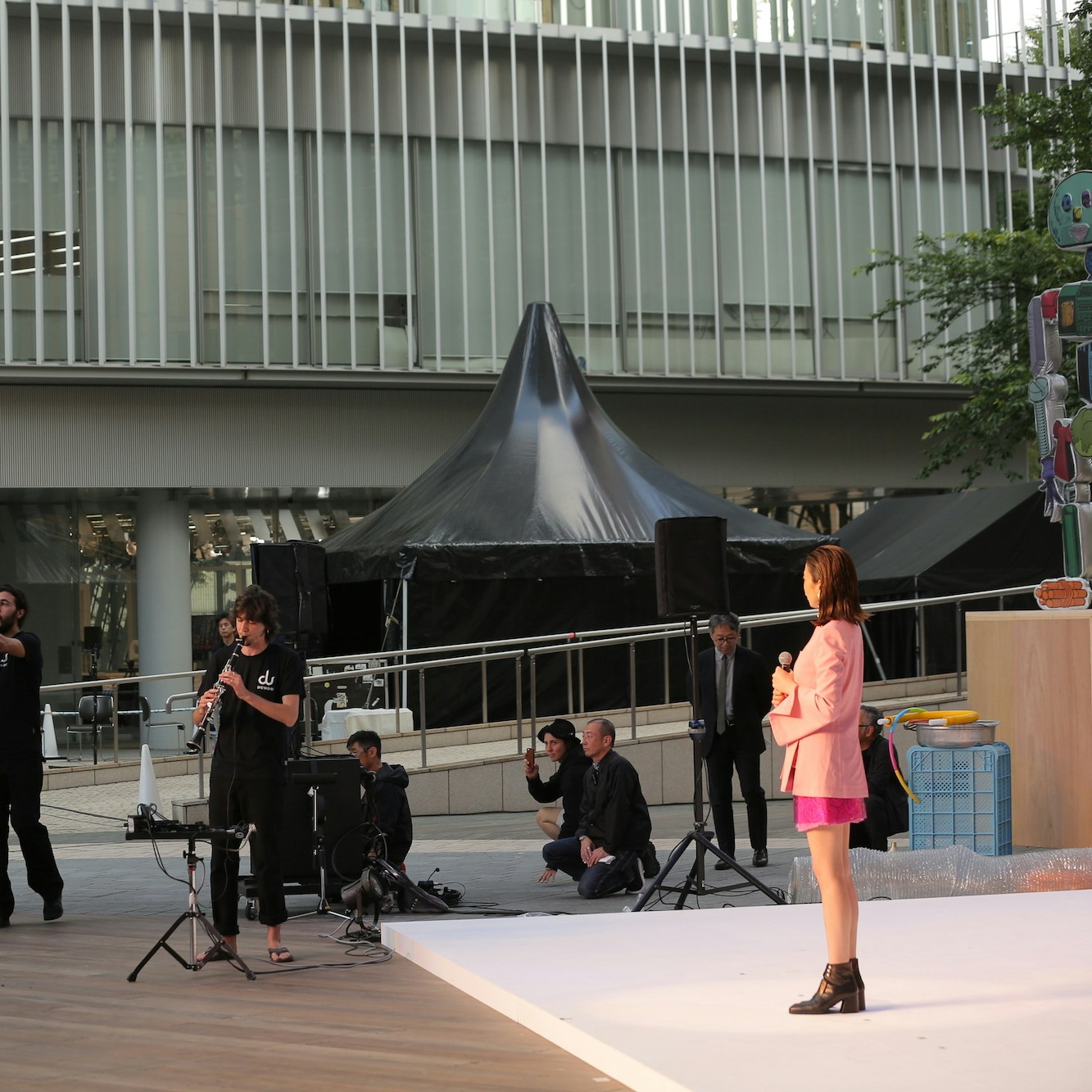 金氏徹平は巨大なインスタレーション《タワー》を六本木ヒルズアリーナに設置。本作には、ミュージシャンのオオルタイチと柴田聡子、ダンサーの島地保武、女優の青柳いづみ、サウンド・アーティストの荒木優光と小松千倫、ドラムの和田晋侍、映像作家の山田晋平をはじめ、劇作家の岡田利規、アーティストのcontactGonzoなどが集い、金氏のハイブリッドなコラージュ彫刻の造形とパフォーマンスの共演を楽しむことができる。
