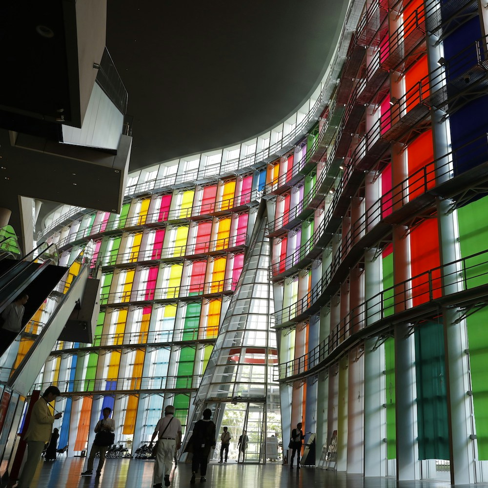 また鬼頭健吾はカラフルな布の滝《hangingcolors》を国立新美術館のガラスのファサードで展開。美術館の内部を多彩な光で満たすとともに、夜間には美術館を鮮やかな光で彩る。また、国立新美術館の正面玄関前に鏡を敷き詰め、花の映像を投影する《brokenflowers》も見逃せない。
