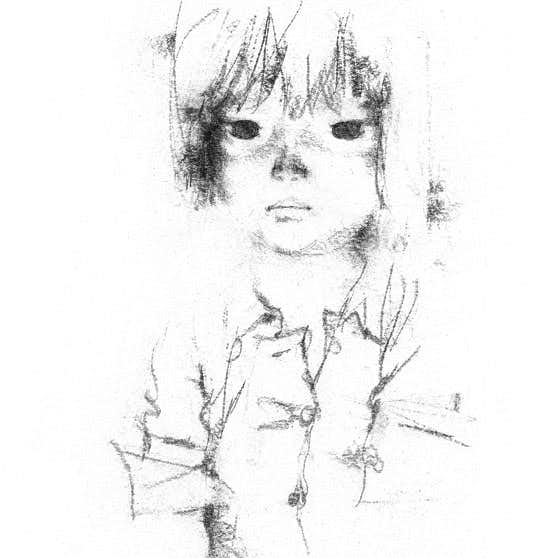 そしていわさきは60年代、被爆した子供たちの作文や詩を編んだ本『わたしがちいさかったときに』(童心社、1967)のために作品を制作。まっすぐ前を見つめる少女や焼跡を見つめる少年といった、被爆した子供たちの姿を鉛筆と墨で描き、「戦争の悲惨さというのは子供たちの手記を読めば十分すぎるほどわかります。私の役割は、どんなに可愛い子供たちがその場におかれていたかを伝えることです」と語ったという。