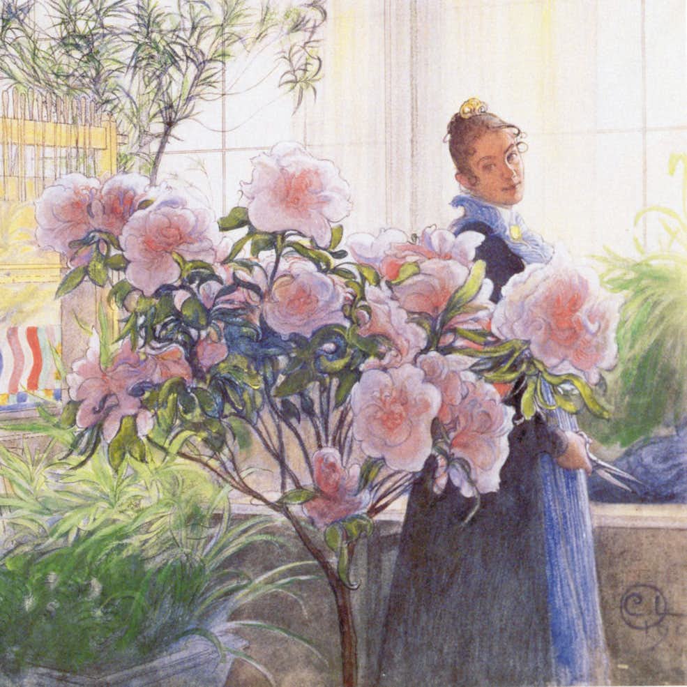 カール・ラーション(1853〜1919) はストックホルム生まれの画家。印象派やイタリアのフレスコ画、ジャポニスムに刺激を受けながら、独自の線描様式や平面的な彩色を確立した。同時代のスウェーデンの画家のなかでもっとも日本美術に親しんだことでも知られている。