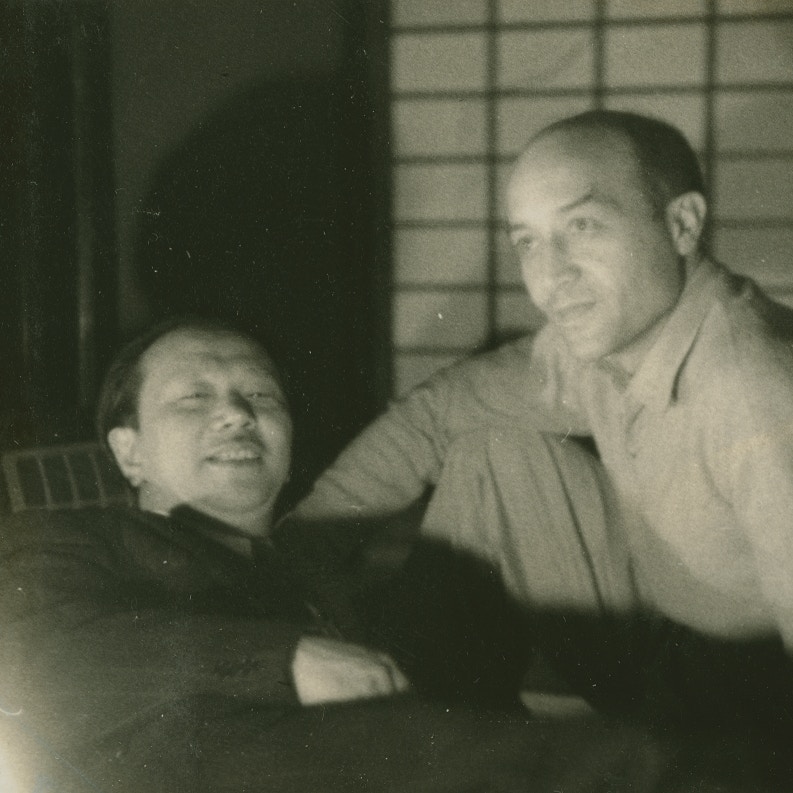 1950年、日本アヴァンギャルド美術家クラブ主宰で行われたイサム・ノグチの歓迎会で初めて出会ったイサム・ノグチ(1904〜88)と岡本太郎(1911〜96)。彫刻家として世界的に活躍していたノグチと、パリで青年期を過ごしたのち帰国し、日本芸術を異邦人の目で見ていた岡本は、ともに欧米で活躍し、「越境者」として新たな表現活動を展開した。