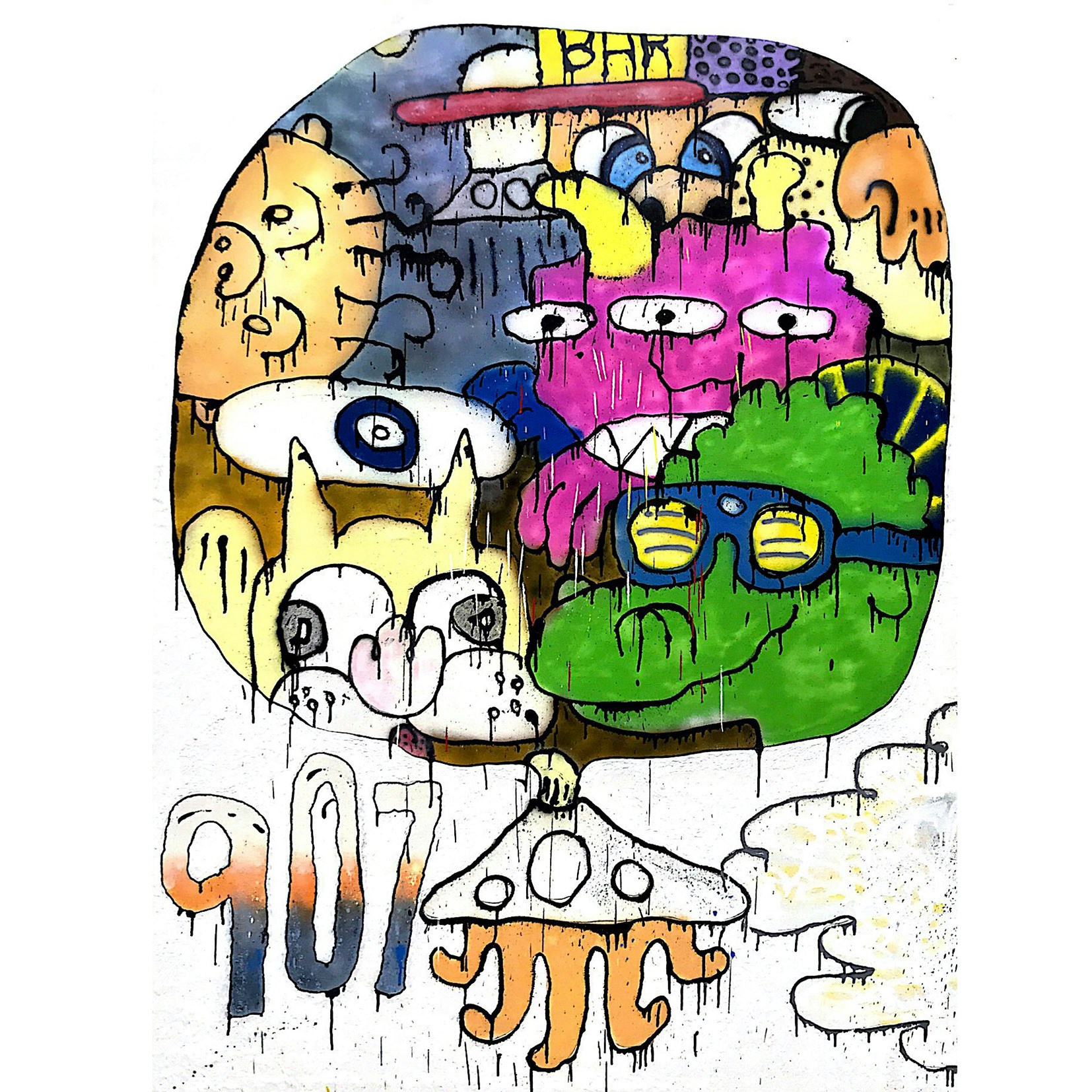 UFO907は学生時代、美術学校を中退。その後、20年あまりストリートで経験を積み、再びファインアートの世界に舞い戻った。そのような過程を経て、今回Hidari Zingaroで開催される個展「Flat Earth Flat Wall Flat Ass」では、スタジオ制作にシフトチェンジした後のペインティング作品を中心に、近作を発表している。