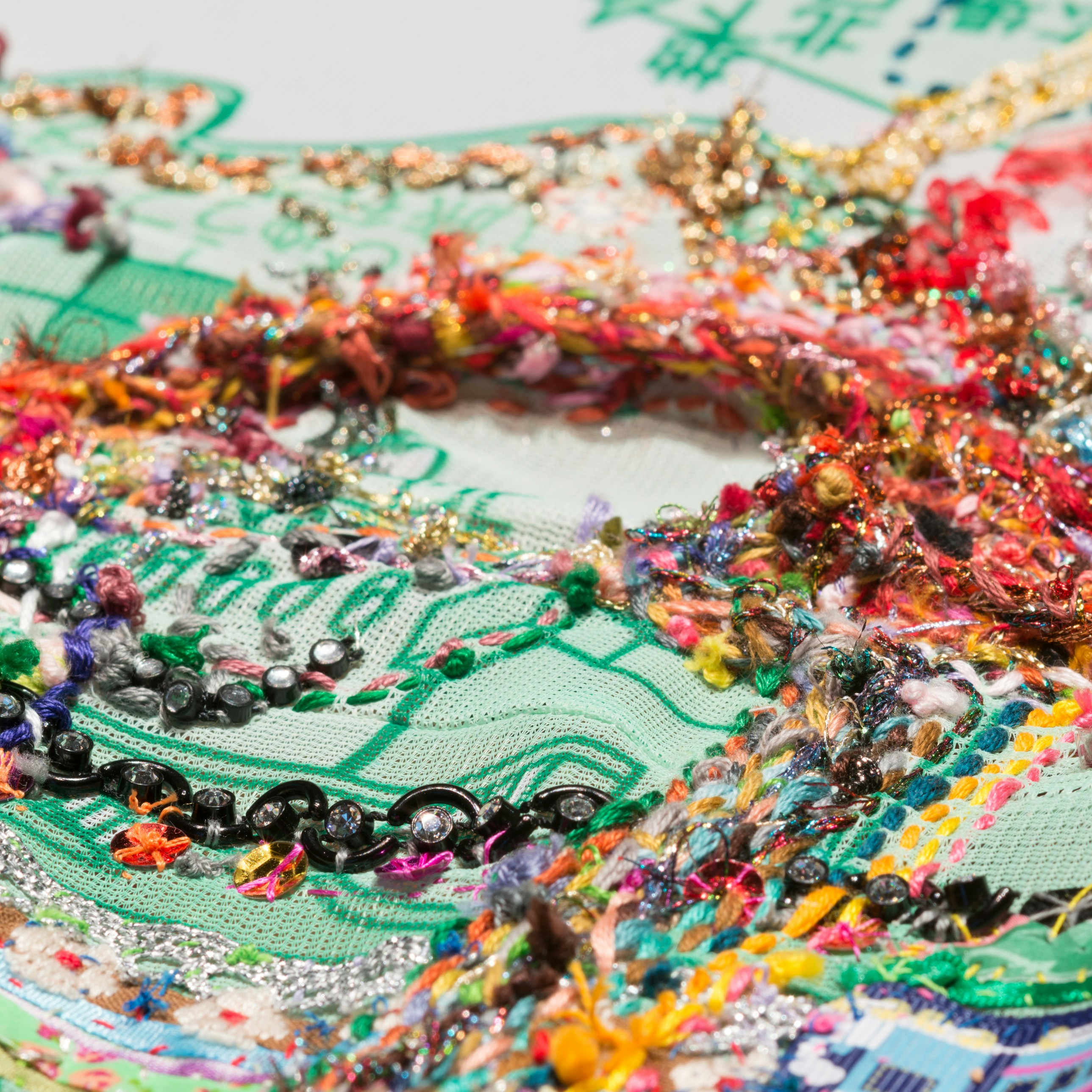 国内外の様々な土地を旅し、そこで生まれた感情や体験、出逢いを、色とりどりの縫い目に込めて表現する秋山。地図などに色彩豊かな糸を縫い込んだ作品のほか、旅先から送った手紙や現地で収集した素材を用いたインスタレーションなど、自己と場所の関係性を色濃く反映した作品を発表してきた。