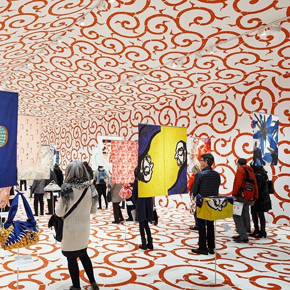 1960年代に注目されたポップアートに着想を得て、日常的かつカラフルな素材を用いて作品を制作してきたジョンファ。今回メイン・プログラムのひとつとして、国立新美術館の正門チケットブース横で一般参加型のアートプログラムも実施。参加者に寄付してもらったプラスチック製のカゴや皿、鍋などを積み重ね、抽象彫刻や寺院の柱のような作品を生み出すという。