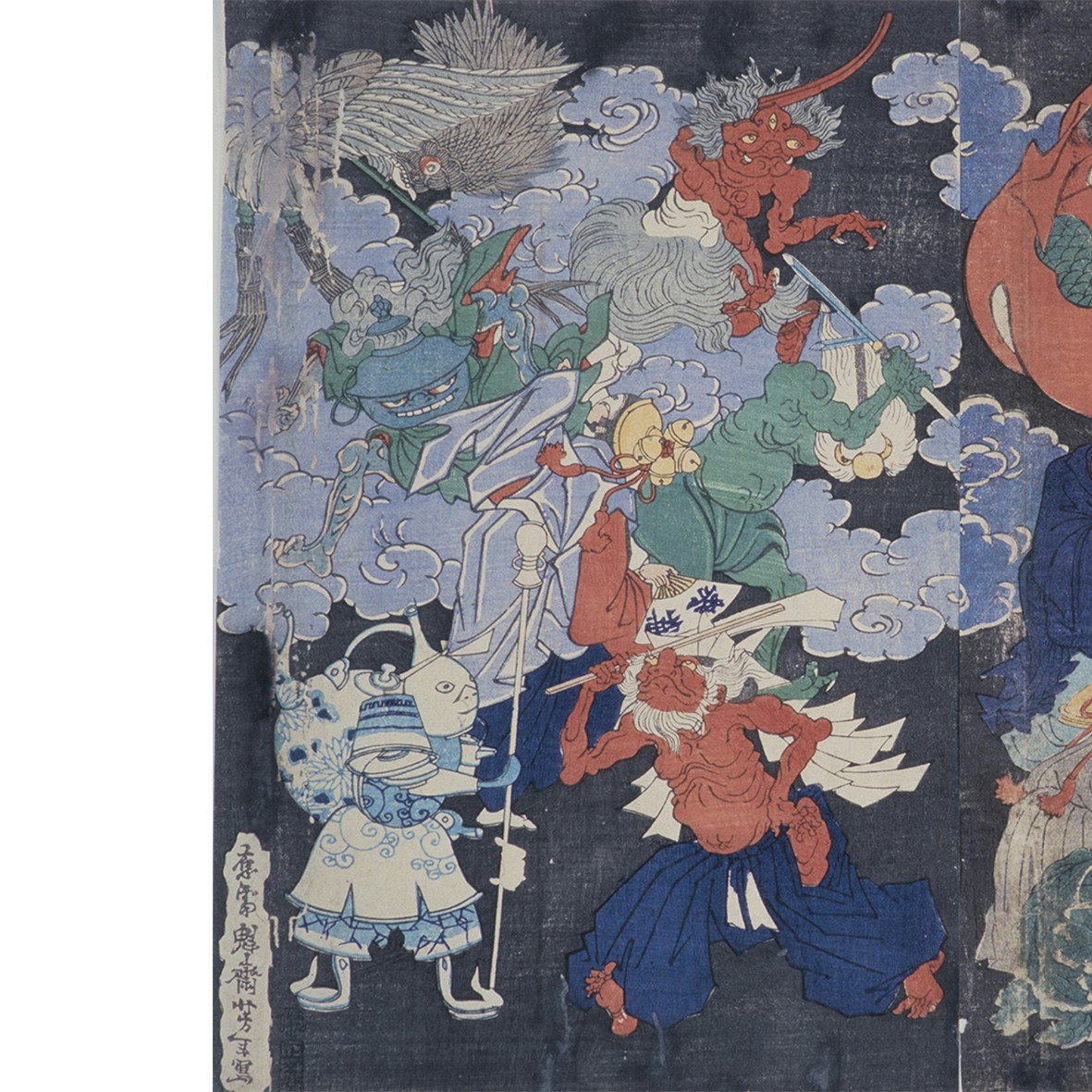 また、地獄絵巻に登場する鬼の姿や、江戸や明治時代の浮世絵における社会を風刺する存在としての妖怪の姿も展観。人間の姿を一部残した幽霊や骸骨など、人間と妖怪のあいだに位置する存在の特徴を検証することで、妖怪とヒトの境界を探っていく。