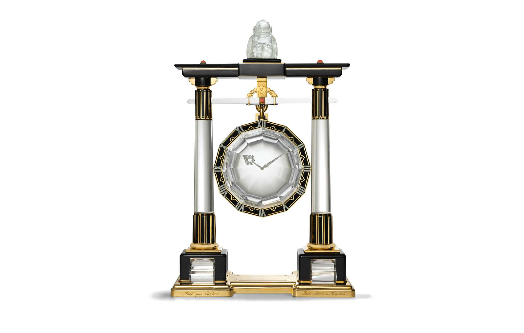 大型の「ポルティコ」ミステリークロック カルティエ パリ、1923 ゴールド、プラチナ、ロッククリスタル、ダイヤモンド、コーラル、オニキス、ブラックエナメル カルティエ コレクション Marian Gérard, Collection Cartier © Cartier