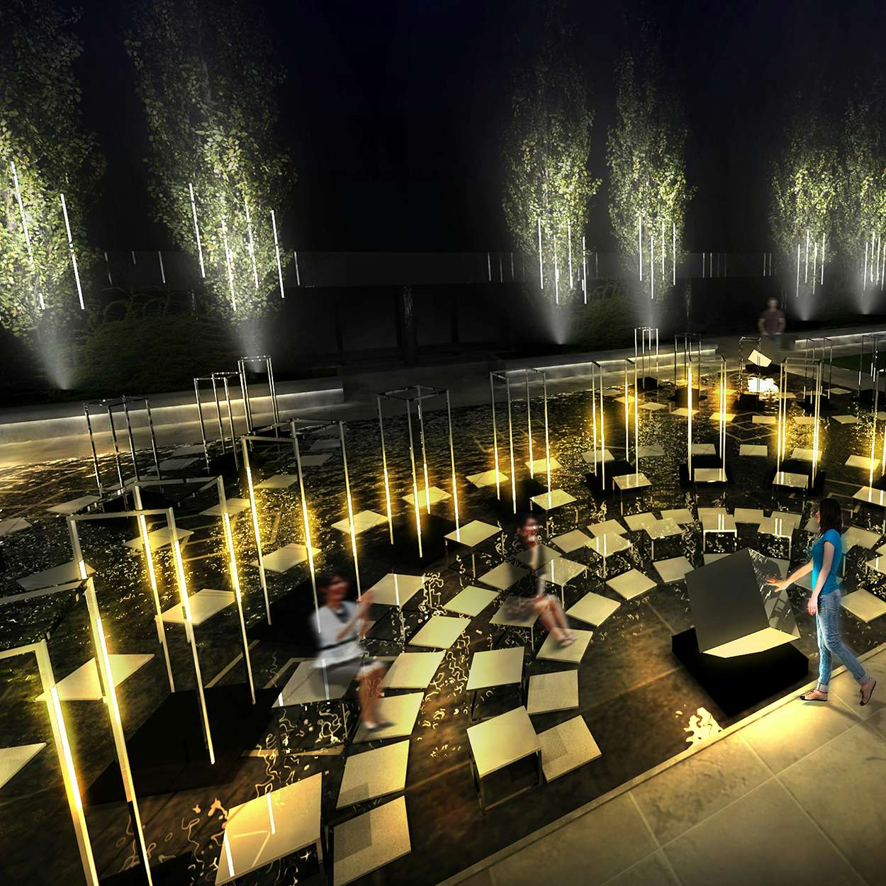 作品は「オーケストラの演奏台」をイメージした6つのモニュメントと、それを囲う光の柱で構成。来場者が打楽器のようにモニュメントを叩くことで音と光が連動し、空間全体が奏でる「作曲者がいないオーケストラ」を体験することができる。また30分に1回、オーケストラによる演奏前の調律のような特別演出も実施されるという。