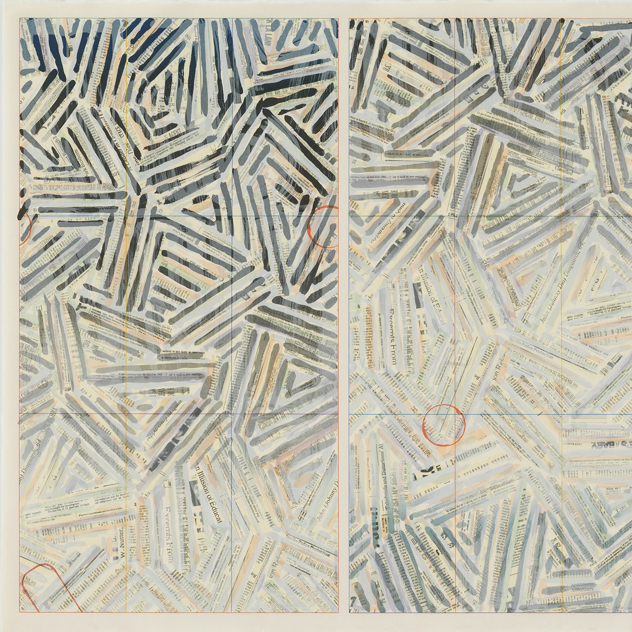 またジョーンズは80年、卓越した技術を持つ刷り師である川西浩史、野中健次郎、島田毅がニューヨークで設立した「シムカ プリント アーチスツ」でプリントを制作。81年からは新聞記事の文字を基盤とした作品を手がけたほか、シリーズ後期の作品では生き生きとした色味が影を潜め、黒と白の顔料による結晶のような構造が組み立てられている。本展ではこうしたシリーズの変遷とともに、ジョーンズが見出した抽象表現と日本哲学のつながりを垣間見ることができるだろう。