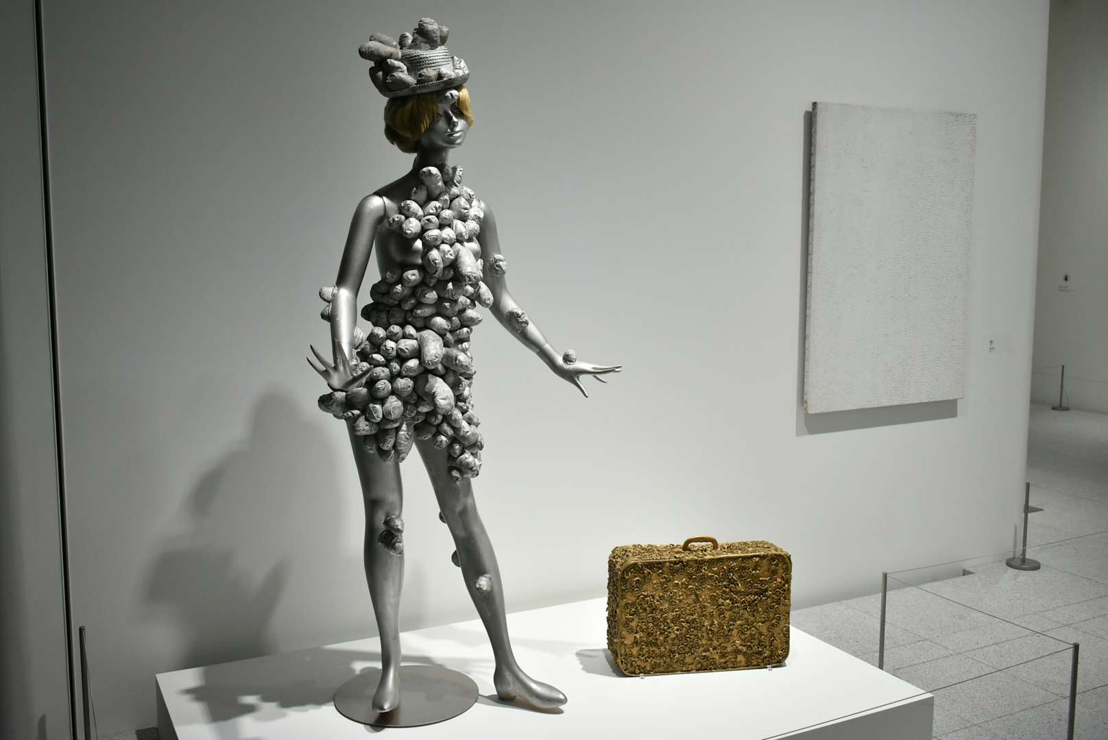 草間が「ゼロ」の関連展覧会に出品したのは、網目模様を一面に反復させたモノクロームの絵画「無限の網」シリーズや、カバンや衣服の表面にマカロニを貼り付けた立体作品、男根状の突起を無数に貼り付けたソフト・スカルプチュアなどの「集積」シリーズ。それらのシリーズが、展示室の入口の3作品によって紹介される。
