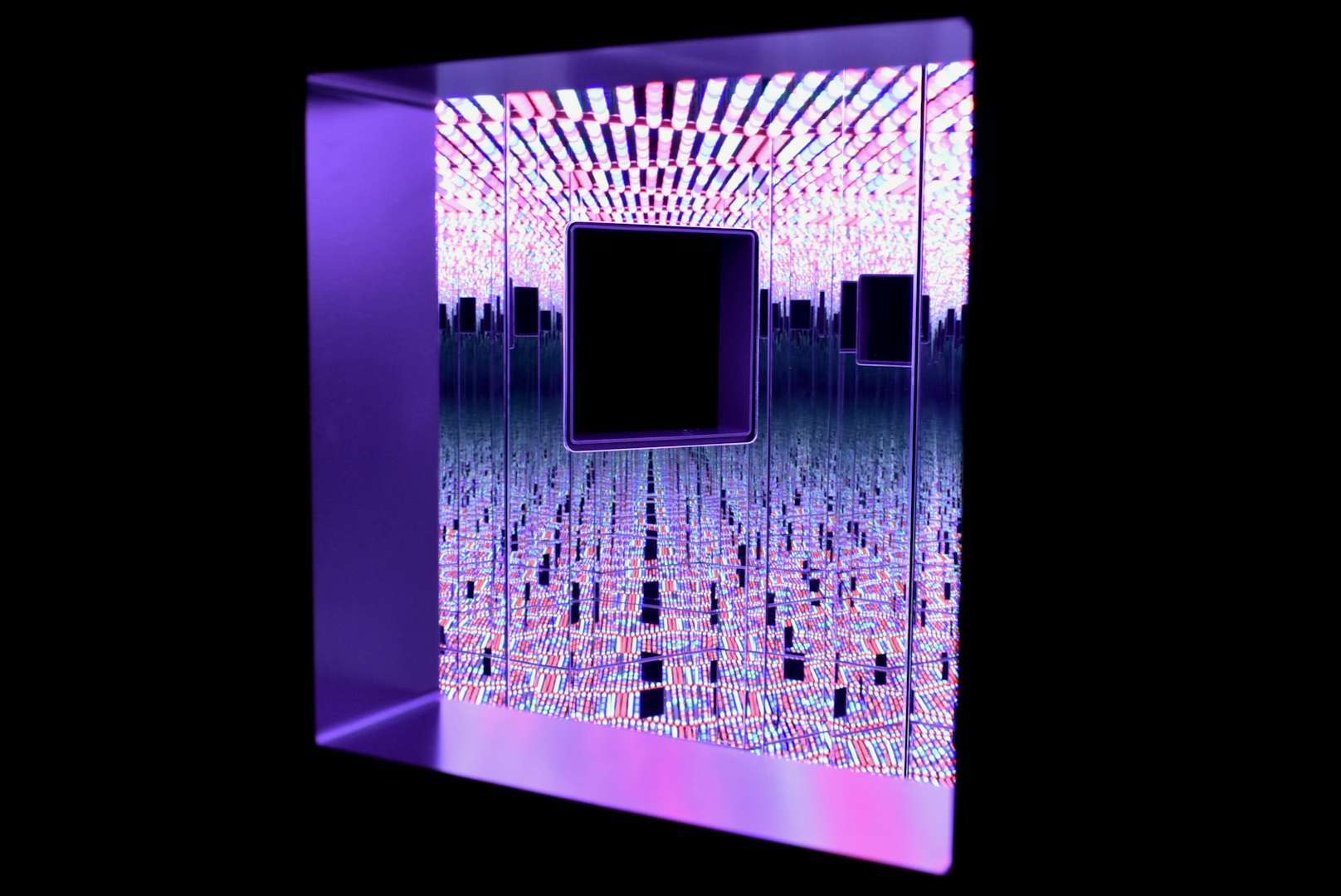 4階では世界初公開となる草間の新作《無限なる天国への憧れ》(2020)を展示。本作は、65年にオランダ・ハーグで企画され、天候や経済的問題により実現しなかったグループ展「海の上のゼロ」に出品予定だった、六角形のミラールーム作品《愛はとこしえ》と同シリーズの作品だ。暗室のなかのカラフルな電球が明滅する部屋を覗きこむと、合わせ鏡がつくり出した無限に広がる空間を体験することができる。