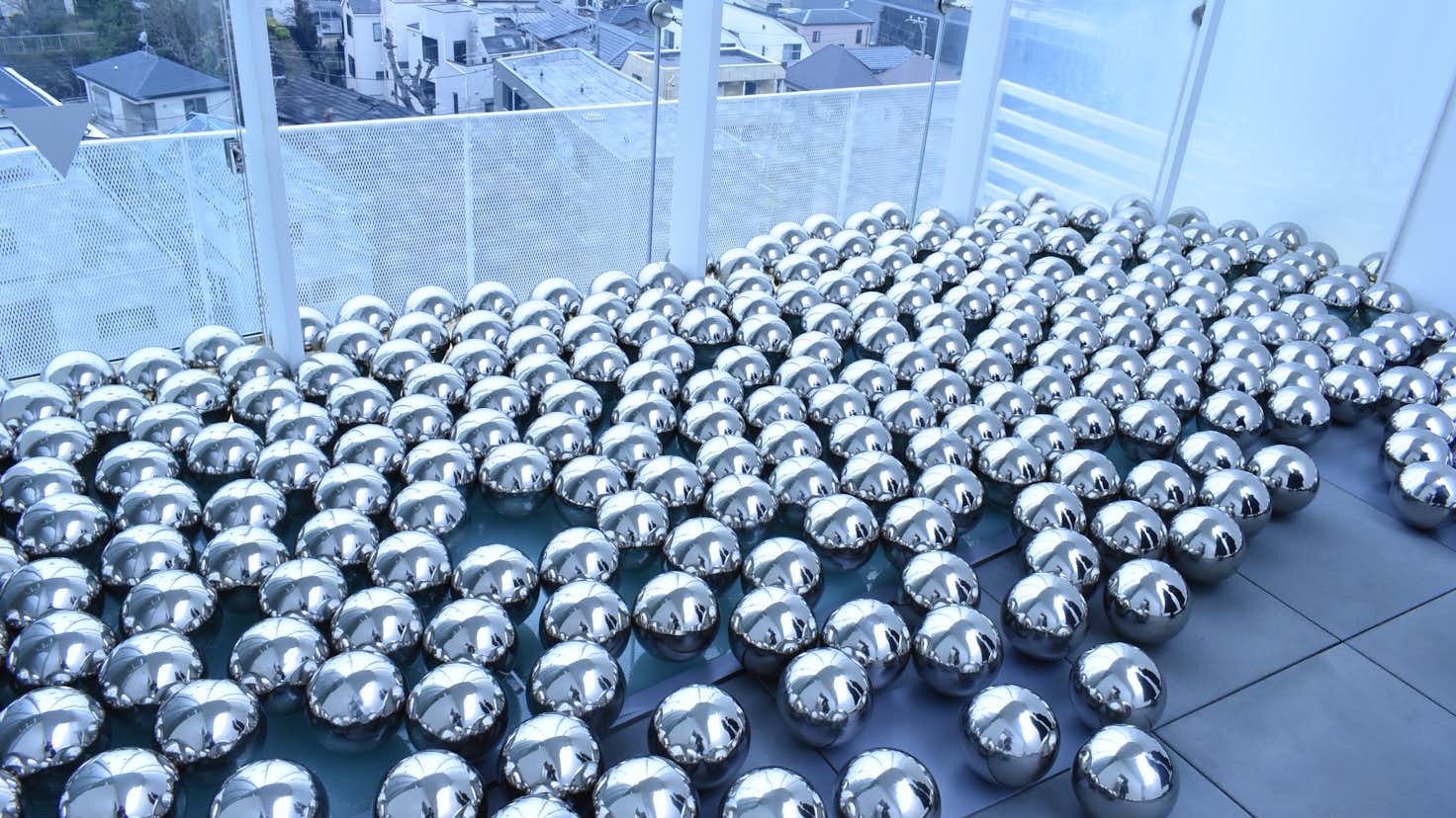 さらに、展示室から屋外に出ると、66年の第33回ヴェネチア・ビエンナーレで初めて発表された、地面にいくつも並んだミラーボールにより構成される草間彌生《ナルシスの庭》(1966/2020)を見ることができる。