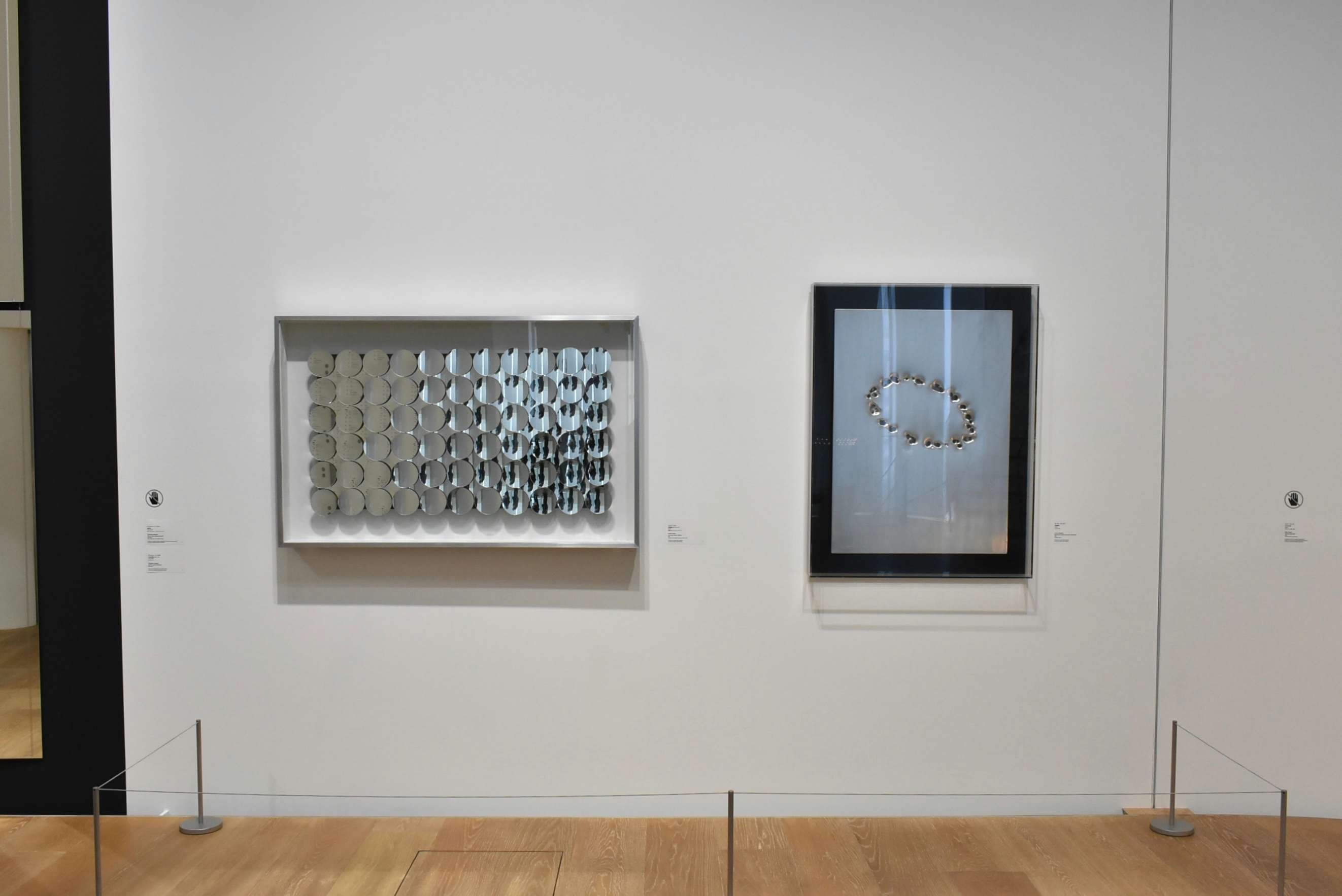 展示風景より、左からアドルフ・ルター《凹面鏡のオブジェクト》(1967)、ルーチョ・フォンタナ《空間概念》(1965)