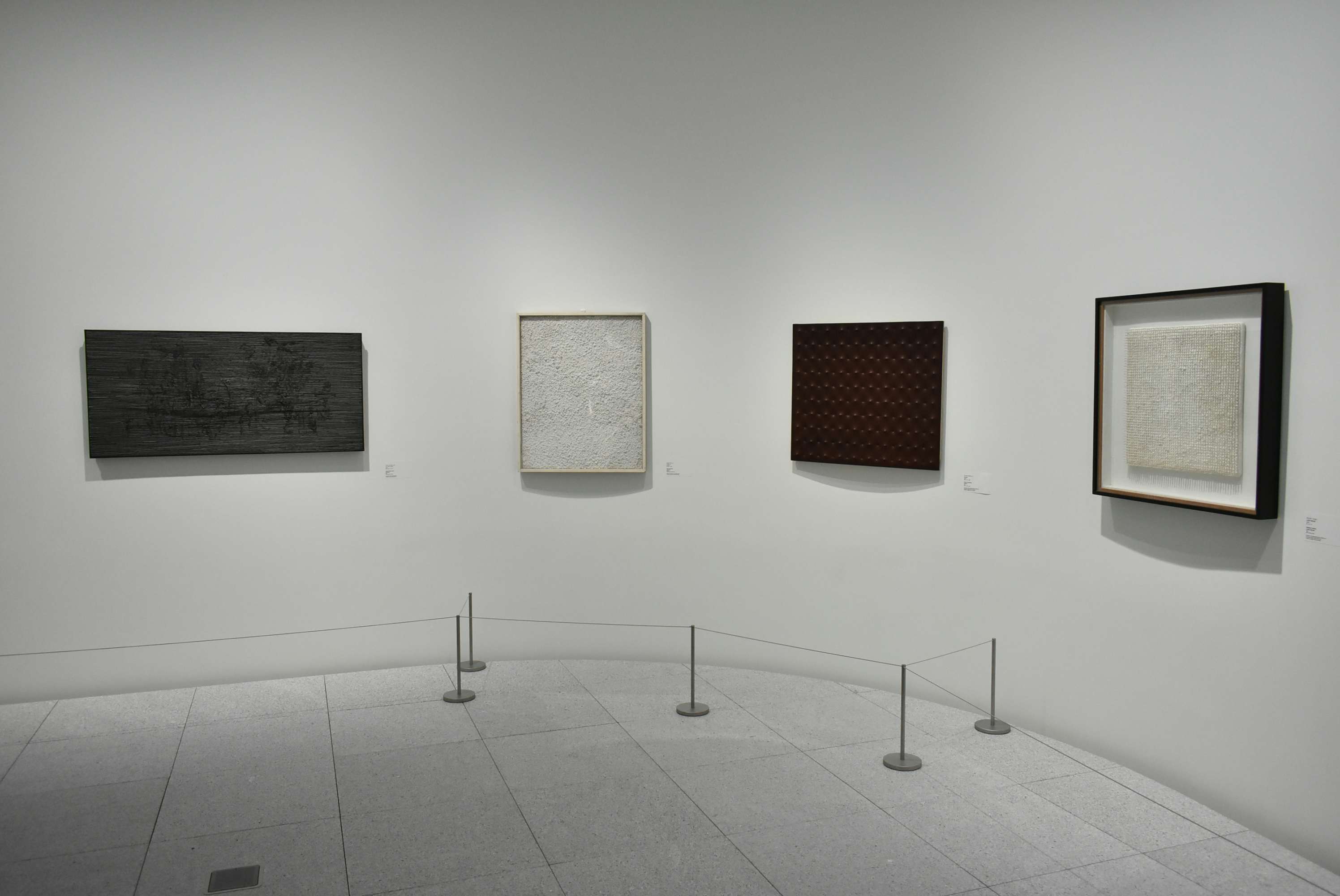 展示風景より、左からヘスス・ラファエル・ソト《ヴァイブレーション》(1958)、ピエロ・マンゾーニ《アクローム》(1962-63)、エンリコ・カステラーニ《Surface》(1962)、ギュンター・ユッカー《LIGHT RELIEF》(1959)