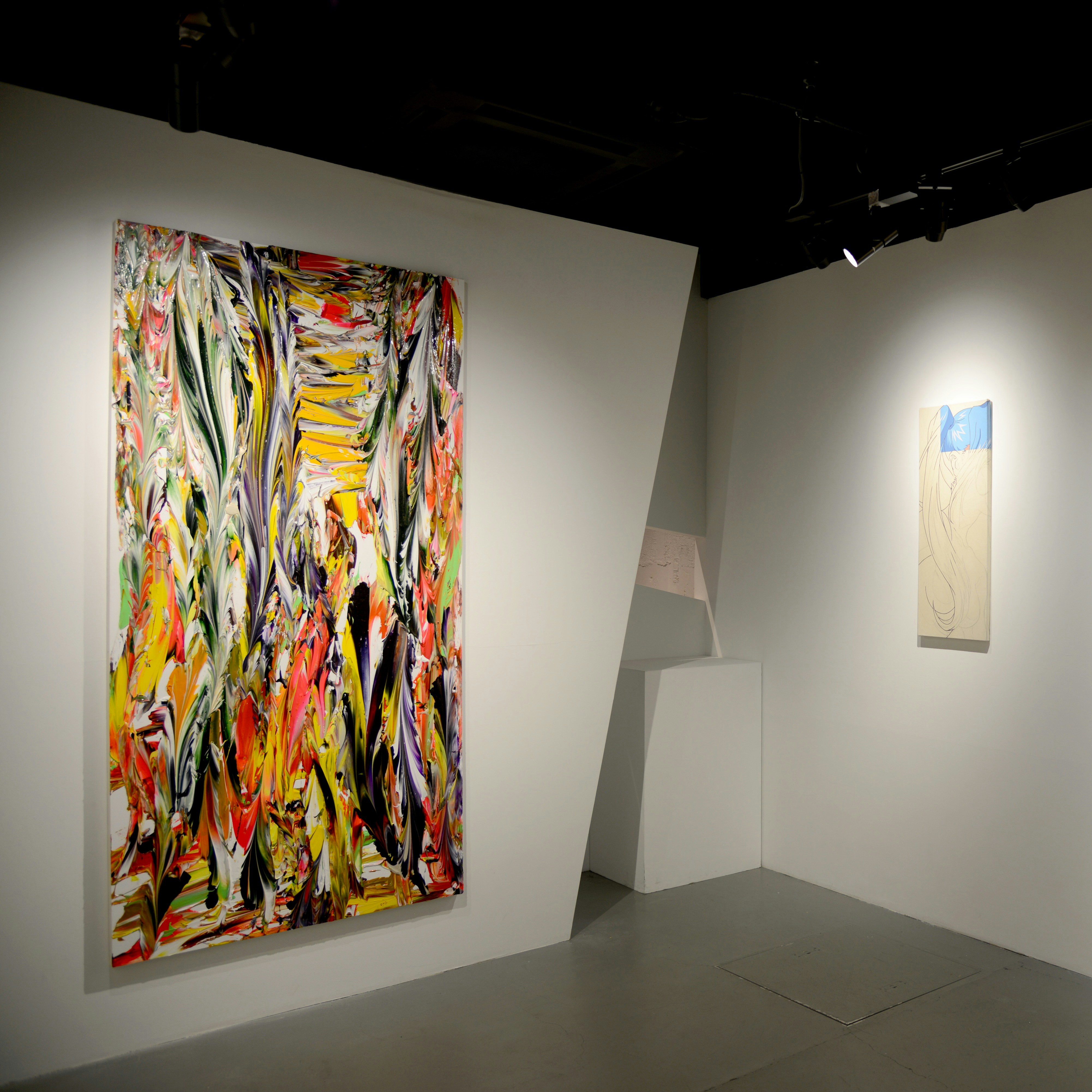 2002年に東京造形大学を卒業して以来、色の持つ触覚的な質感を絵具から引き出し、強いストロークと鮮やかな色彩によって抽象絵画の可能性を広げてきた門田光雅(かどた・みつまさ)と、20年の春に同大学を卒業する藍嘉比沙耶(あおかび・さや)。藍嘉比は、門田にとっての原風景ともいえる1990年代の日本アニメを彷彿とさせるキャラクター造形をモチーフに、絵画の探求を続けてきた。