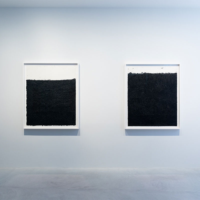 本シリーズの制作プロセスは、平らな表面に、インパストやエッチングインク、シリカなどの様々な顔料でつくった黒色を厚塗りし、その上に丈夫な紙をプレス。最後に黒の塊が乗った紙を取り除くと、粘り気のある不規則な鉛の質感が現れる……というものだ。鉄の道具と体重だけで顔料を動かし、ユニークな画面を生み出す本シリーズは、作家の動作と素材の間のダイナミックな相互作用を視覚化したものといえるだろう。