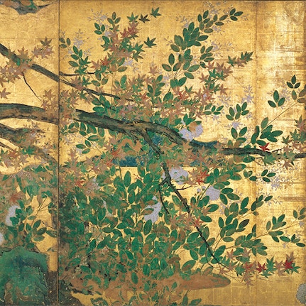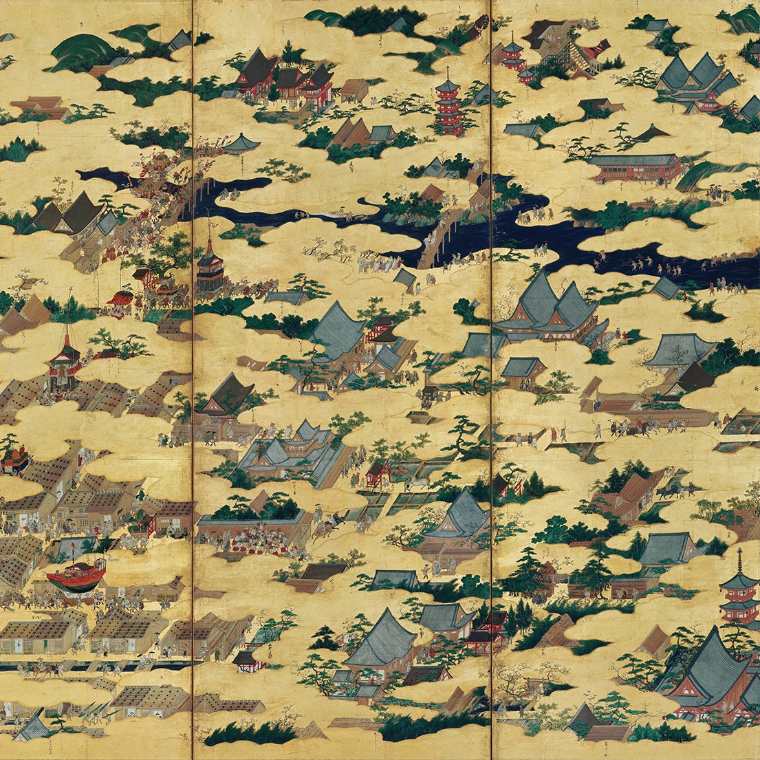 絵画においては、狩野永徳や長谷川等伯に代表される、安土桃山時代の画家たちによる障屏画を中心に紹介。また、それら絵画が生まれる土台を築いたとされる、室町時代後期の禅宗寺院の大画面障壁画や京を描いた洛中図、金屛風なども展示する。
