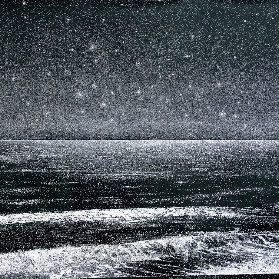 幼少期を海辺の町で過ごした塙は、星々の集積によって満天に立ち現れる海景を、黒い光沢紙に白いペンの点描で描き出す。画面全体に広がる白点の肌理による光のハレーションは、広大な海の前にただひとり立ったときのような深い内省を感じさせる。ドローイングでは、何層にも薄く重ねられた繊細な色鉛筆による線によって、 人型のモニュメントや花々などが描かれ、優しさと悲しみ、愛情などの心の機微が具現化されている。