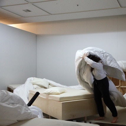 1993年大阪府生まれの宮木は、日々の生活で生じる環境の変化や生への葛藤を制作の原点にし、社会における私的要素と公共的要素との関係性に着目しているアーティスト。京都市立芸術大学ギャラリー@KCUAで発表された《眠りのあきらめ》では、私的な睡眠という行為を公共空間で考察するパフォーマンスを行い、他者がいる空間で、自らが眠りにつく環境を整える実験的な取り組みを試みた。