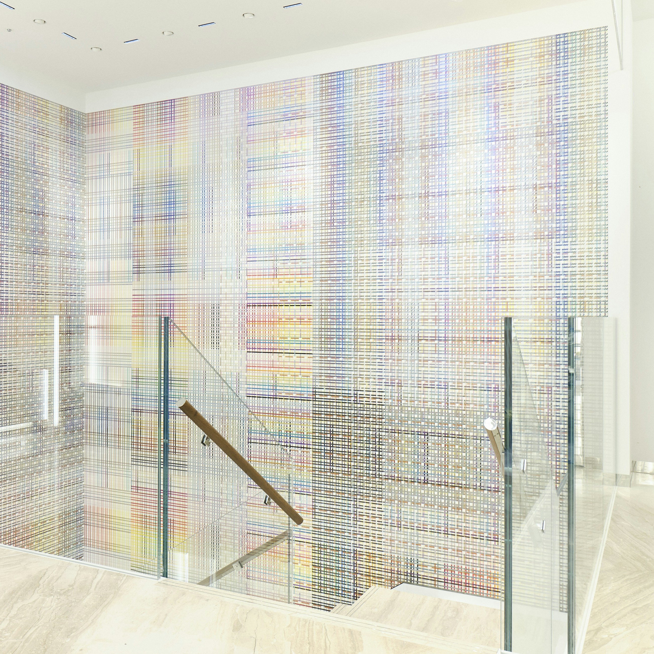 また、神経科学や染織などに影響を受けた川人は1988 年奈良県生まれ。近年、ロンシャン ラ メゾン銀座のコミッションワークに代表されるような壁面全体を使用した大胆なインスタレーションに取り組んできた。緻密な手作業による色の塗り重ねによってグリッドを織りなしていく過程において、否応なく生じてしまう歪みや「ズレ」に関心を寄せており、グリッドを通して未知の領域を探っている。