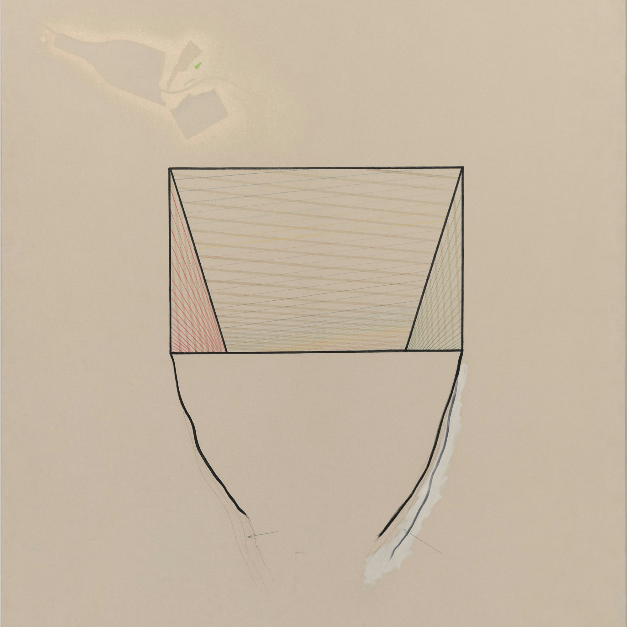 鑑賞者を導き入れる矢印や機械的なダイアグラム、日常のイメージやタイポグラフィが配された荒川の「図形絵画」の多くは大きなキャンバスに描かれ、身体的に知覚できるようにつくられている。平面作品《BOTTOMLESS No. 1》(1965)に描かれた、上下に引き伸ばされ底部が開いた立方体は、血液や精神の内部が流れ出る身体を意味すると言われている。