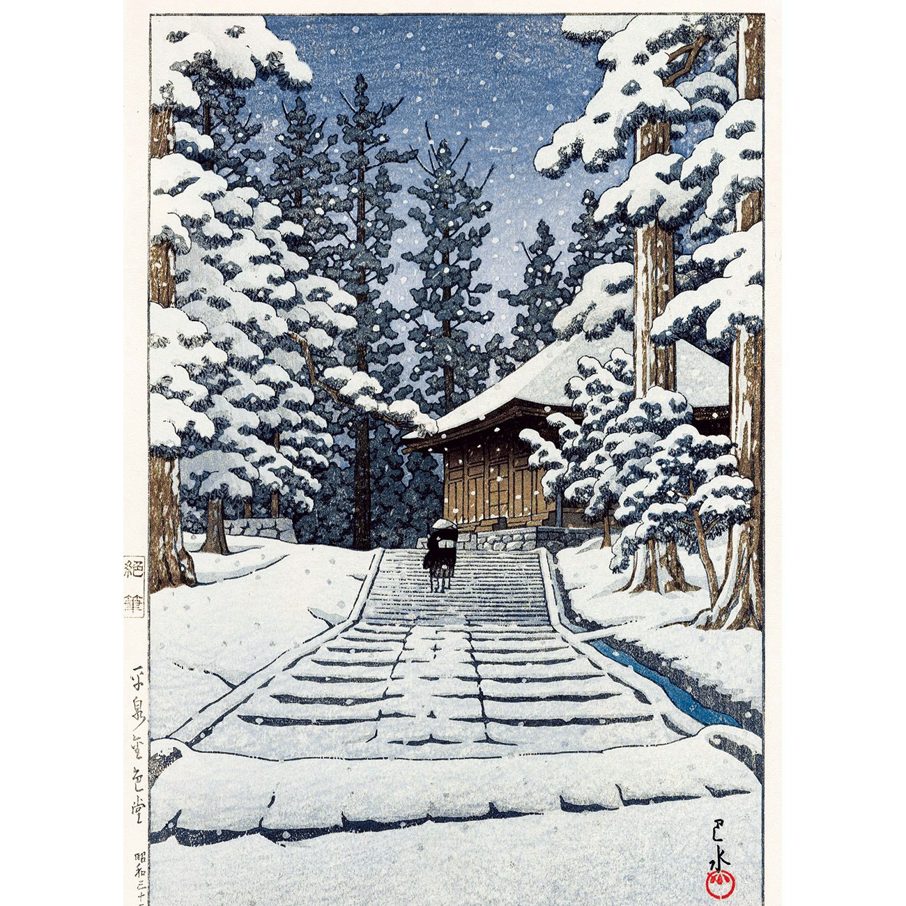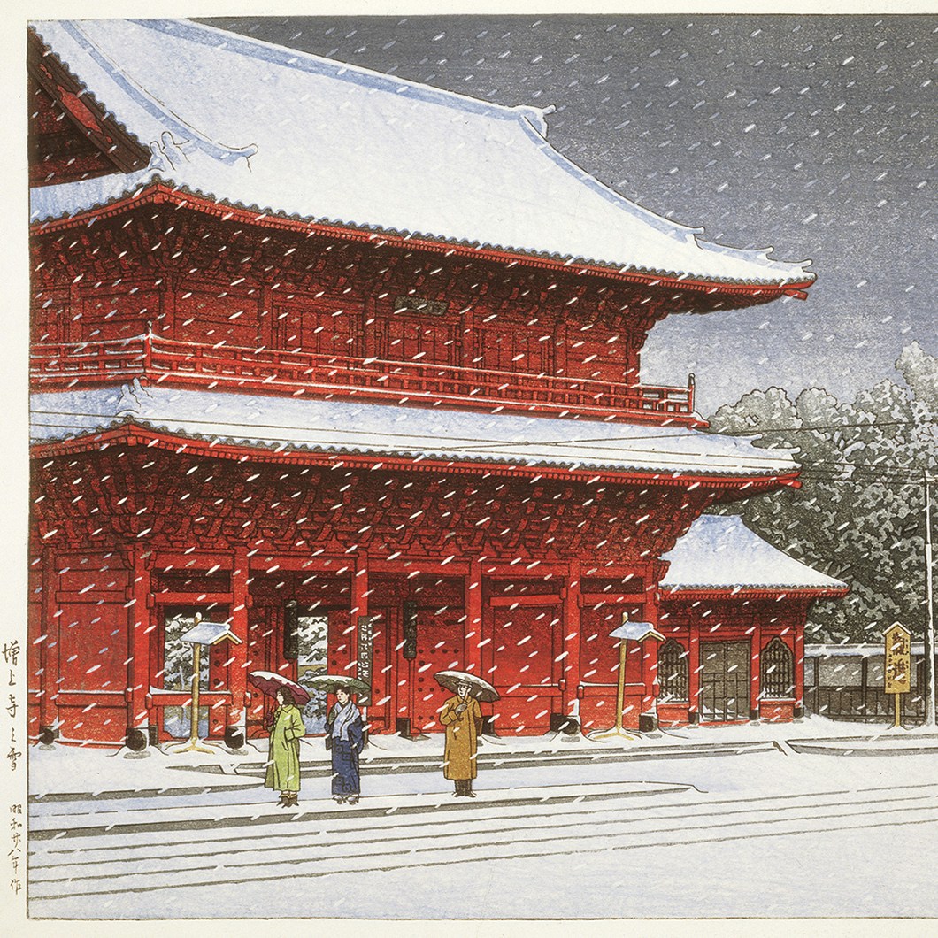 川瀬巴水は大正〜昭和にかけて活躍した版画家。幼少期より絵を描くことを好み、はじめは画家を志したが、27歳で鏑木清方(1878〜1972)の門人となり、同門の伊東深水(1898〜1972)の風景版画「近江八景」に感銘を受け、版画制作へと向かった。1918(大正7)年には版元の渡邊庄三郎の協力を得て塩原の三部作を発表し、木版画デビュー。