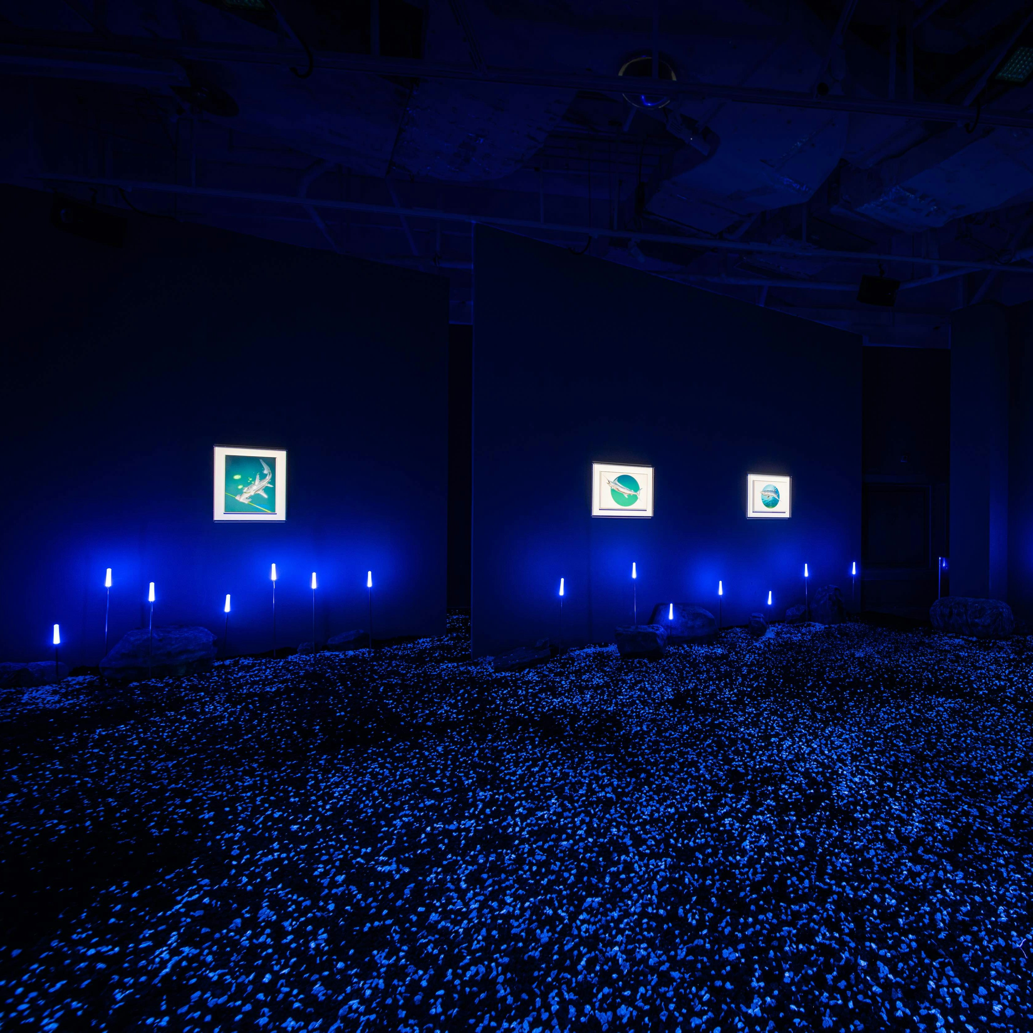 本展では、空山がサメをモチーフにした新作の彫刻作品《Untitled_Giant Shark》が世界で初公開。約1000平米におよぶ展示スペースは本作を手がかりに、「Sinking」「Deep Sea」「Swimming」「Train」という4つの異なるテーマで展開されている。鑑賞者は超現実的な乗り物に搭乗し、架空の深海や時空を舞台に空山の作品世界を体感できる。