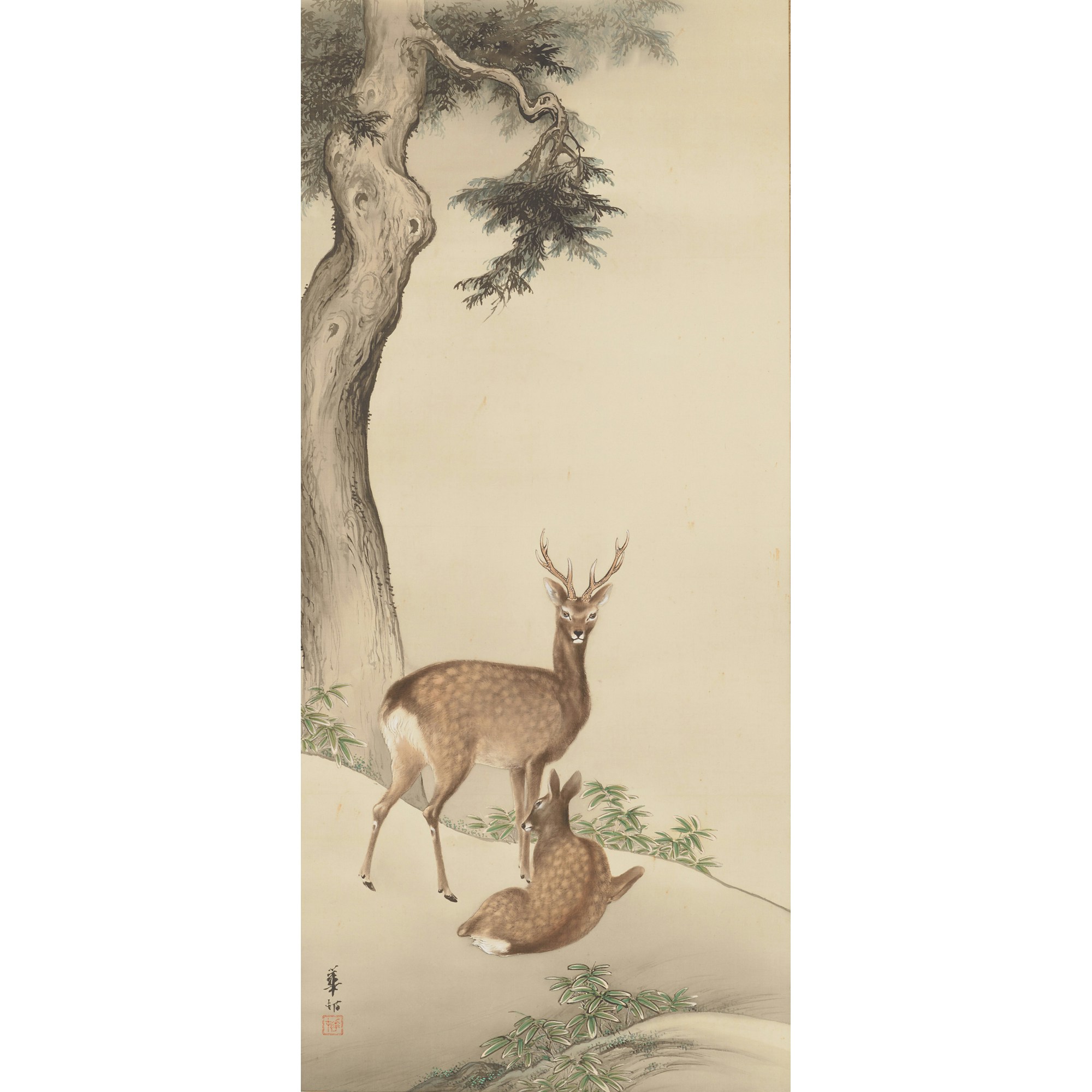 本展では、この華邨の作品を初公開のものを含めて一挙に公開。その画業を振り返り、華邨が描いた花鳥風月の世界の鮮やかさを浮き彫りにするものだ。《花鳥図》《桧樹双鹿図》《秋草に兎図》などいずれも個人蔵でこれまで公開されてこなかった作品からは、高い画力と円山四条派に影響を受けた巧緻な写実性を見ることができる。