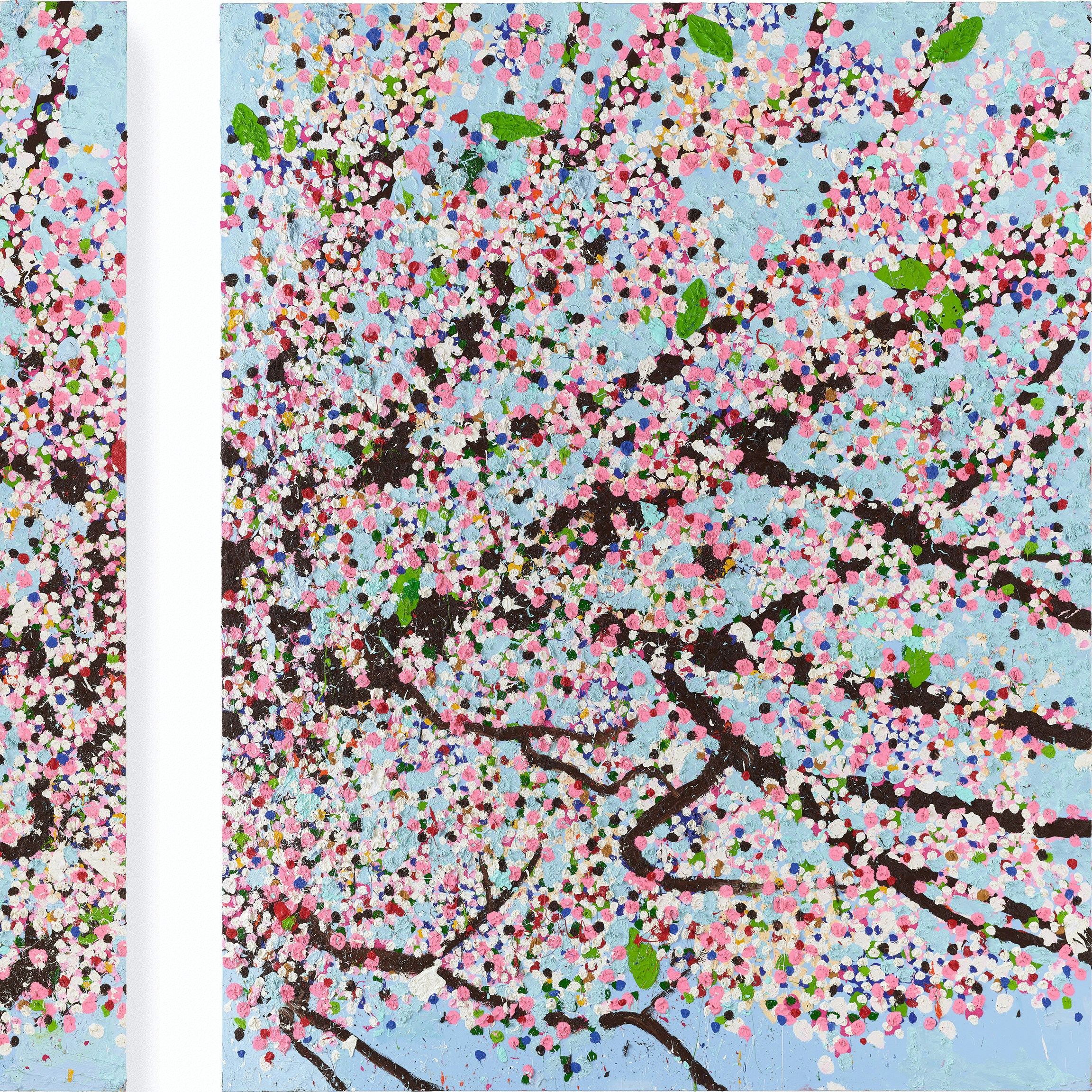 大きいもので縦5メートル、横7メートルを超える画面に描かれた桜。本シリーズは昨年、パリのカルティエ現代美術財団で初めて披露された。本展では、107点の同シリーズからハースト自身が作品を選び、展示空間を構成するという。
