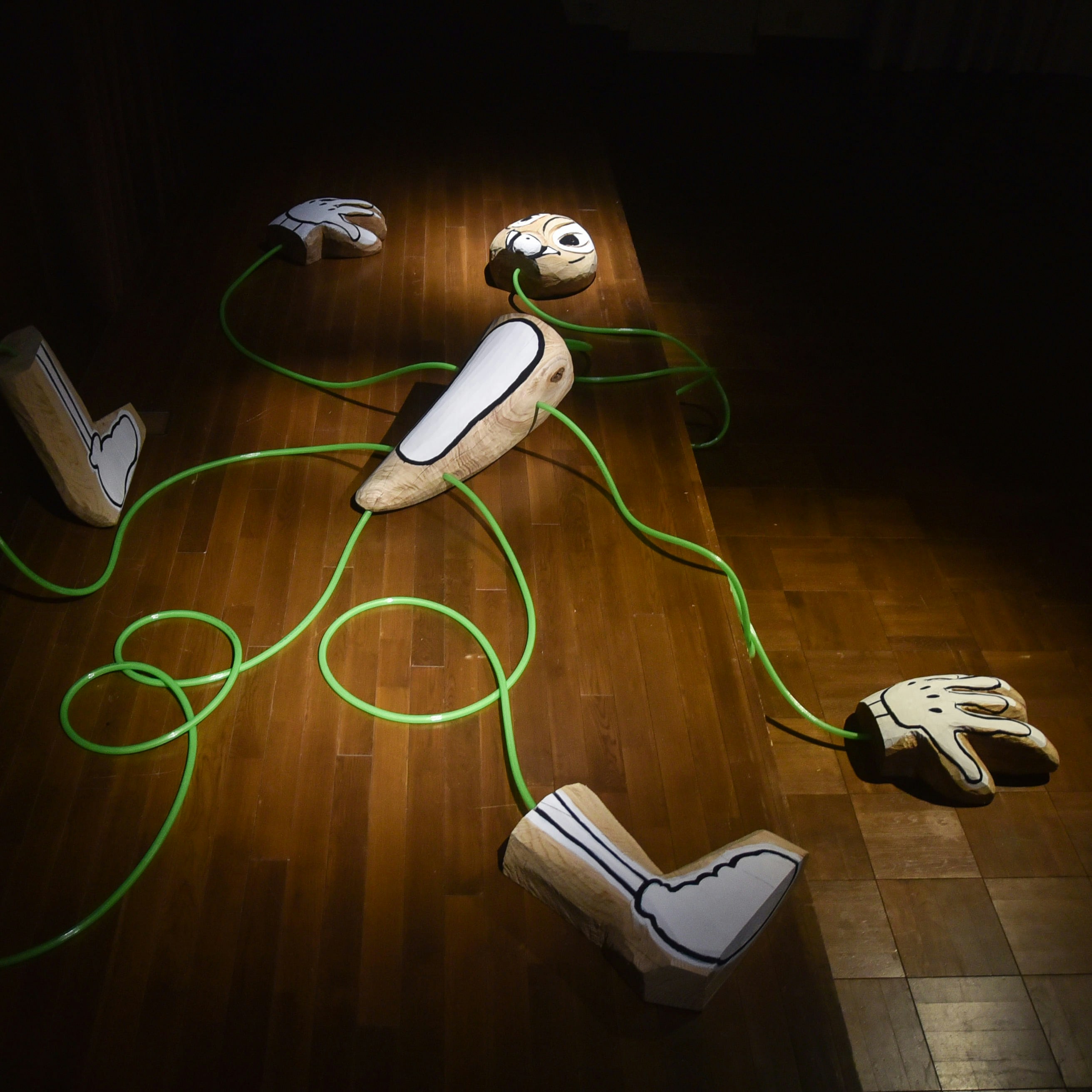 高橋直宏の制作は、主に人体の木彫だ。断片的に繋がれた糸繰り人形のような、部位を不自然に組まれた異形は、物理的な制約の下に人間をどう考察していくか鑑賞者に問いかける。