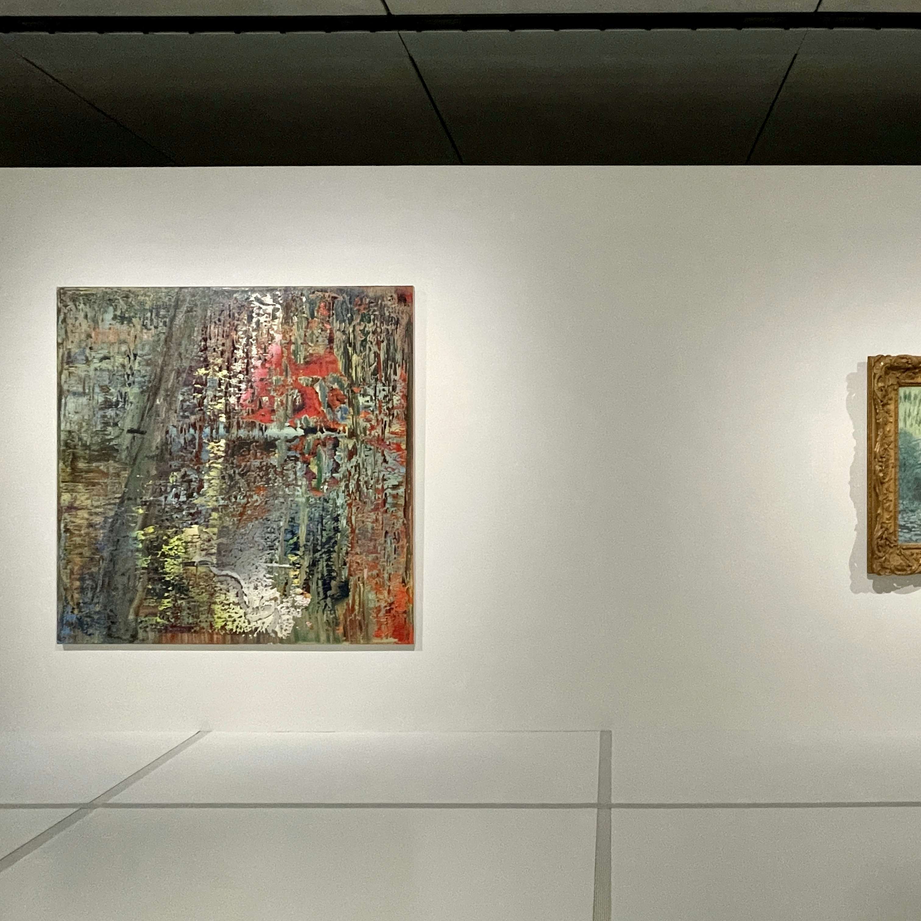 この展覧会では、70年代後半にリヒターが着手した「抽象絵画」シリーズのひとつであり、スタイルとして洗練を迎えた時期の作品《抽象絵画(649-2)》(1987)を、モネの名作《睡蓮の池》(1899)と並べて展示。太鼓橋としだれ柳が描かれた《睡蓮の池》と、一番奥に水を連想させる鮮やかな青が塗られた《抽象絵画(649-2)》の2点を対比して見ることで、時代を超える作品の不思議な共鳴が感じられるだろう。