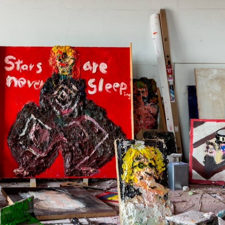 水戸部は大胆な色彩の油絵具を指で幾層にも重ねて創作対象を表現するアーティスト。今年、東京オペラシティ アートギャラリーで開催された「project N 85 水戸部七絵|I am not an Object」をはじめ、個展やグループ展において積極的に作品の発表を続けている。近作ではロックスターのなかにアートへの危機感を映し出す作品を手掛けており、そのシリーズは2021年、東京・渋谷 biscuit galleryでの「Rock is Dead」展に始まり、2022年、東京・南青山 void+での「War is not over」展と続いてきた。