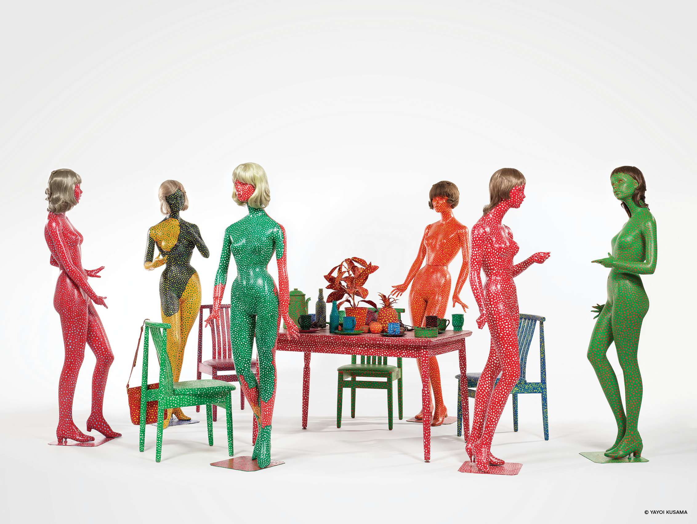 草間彌生 Self-Obliteration 1966-74 ペイントマネキン、テーブル、イス、ウィッグ、ハンドバッグ、マグカップ、皿、ピッチャー、灰皿、プラスチック植物、プラスチック花、プラスチック果実 サイズ可変 M+蔵 © YAYOI KUSAMA Photo: M+, Hong Kong