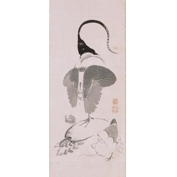 筆の勢いを伝える墨線の大胆かつ力強い質感と、独自の緻密な描法「筋目描き」をもって描かれた鶏の首から胴の繊細さ。実際の作品を目の当たりにすれば、そのどちらも表現してしまう若冲が、いかに卓越した墨絵の名手だったかがわかるだろう。