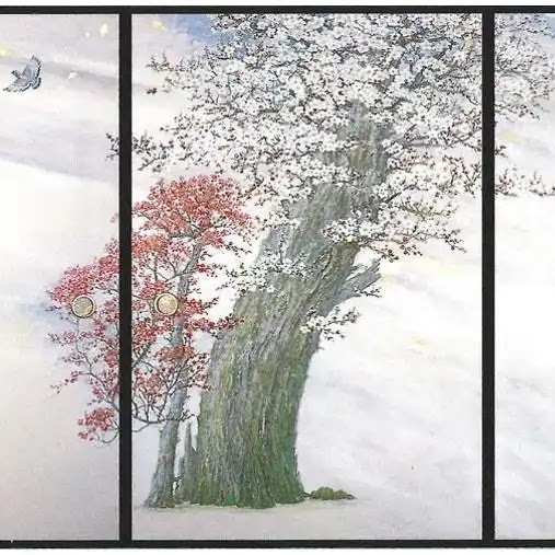 岩澤の最晩年に完成した北の間には「写実の梅」、中の間には「抽象の桜」、南の間には「プラチナと薄墨の山水」という主題で障壁画が制作され、各部屋の趣向を違えながら神々しい世界が表現されているという。