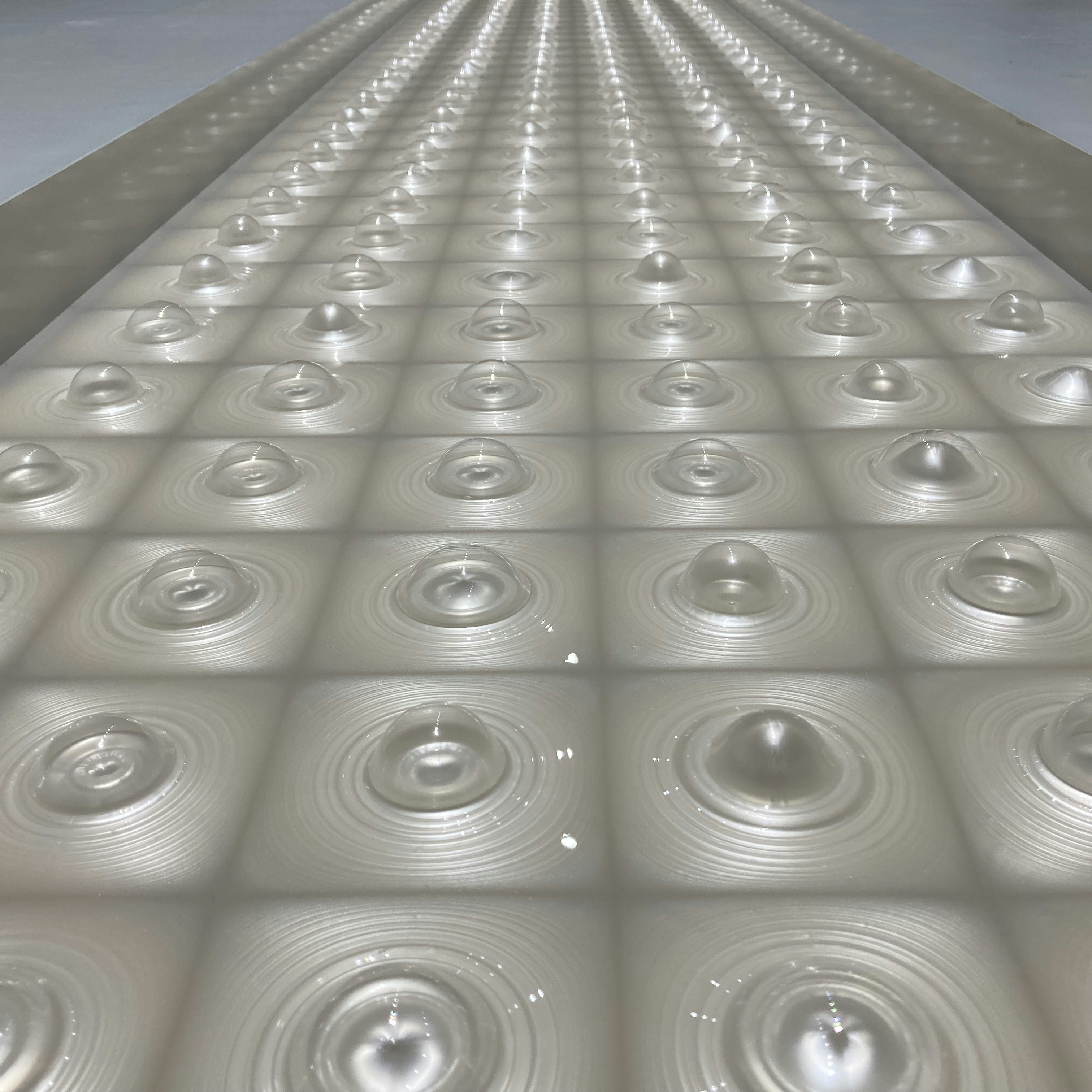 名和は、情報化時代を象徴する《PixCell》や生命と宇宙、感性とテクノロジーの関係をテーマに、重力で描くペインティング《Direction》、シリコーンオイルが空間に降り注ぐ《Force》、液面に現れる泡とグリッドの《Biomatrix》、泡そのものが巨大なボリュームに成長する《Foam》など、彫刻の定義を柔軟に解釈し、鑑賞者に素材の物性がひらかれてくるような知覚体験を生み出してきた。