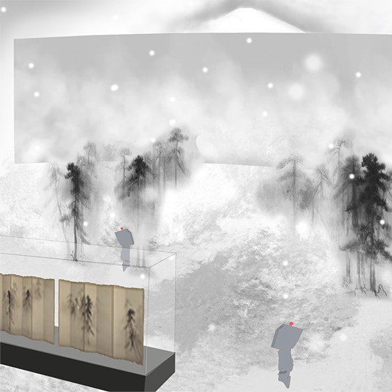 展示室1は東京国立博物館を代表する国宝・長谷川等伯筆《松林図屛風》をテーマとしたバーチャル展示室で、等伯が描いた松林の風景を表現する。また、長谷川等伯は墨1色の濃淡のみで、松林の遠近感を表現したが、空間内に配置された松の一部を動かしてみることで、長谷川等伯による疎密の配置の妙や濃淡のみで表現された松林の遠近感などを体感できる。