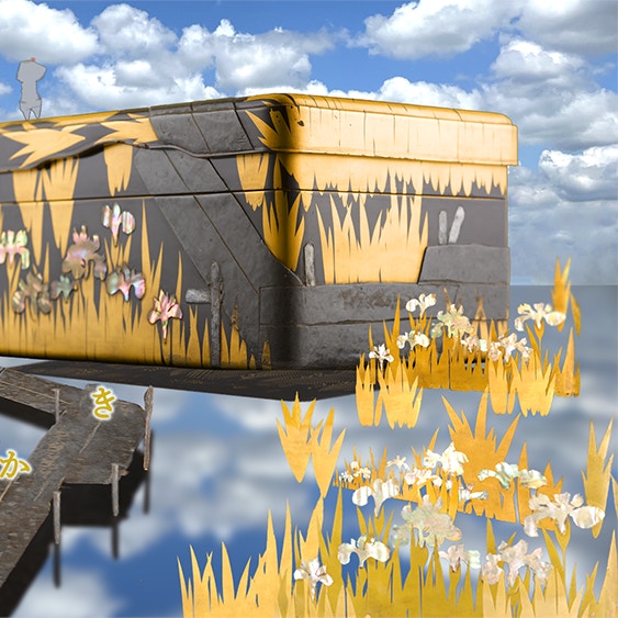 展示室2は尾形光琳の《八橋蒔絵螺鈿硯箱》をテーマとしたバーチャル展示室だ。作品のテーマである「伊勢物語」の「三河国八橋」の情景を表現し、空間に置かれた文字を集めることで「伊勢物語」の主人公が詠んだ和歌を完成させたり、アバターとして硯箱の内部に入りながら、光琳が表現した世界に没入することができる。また、硯箱の内部では光琳が硯箱内外に施したデザインが透け重なって表示されることで、硯箱全体のデザインを鑑賞できる。
