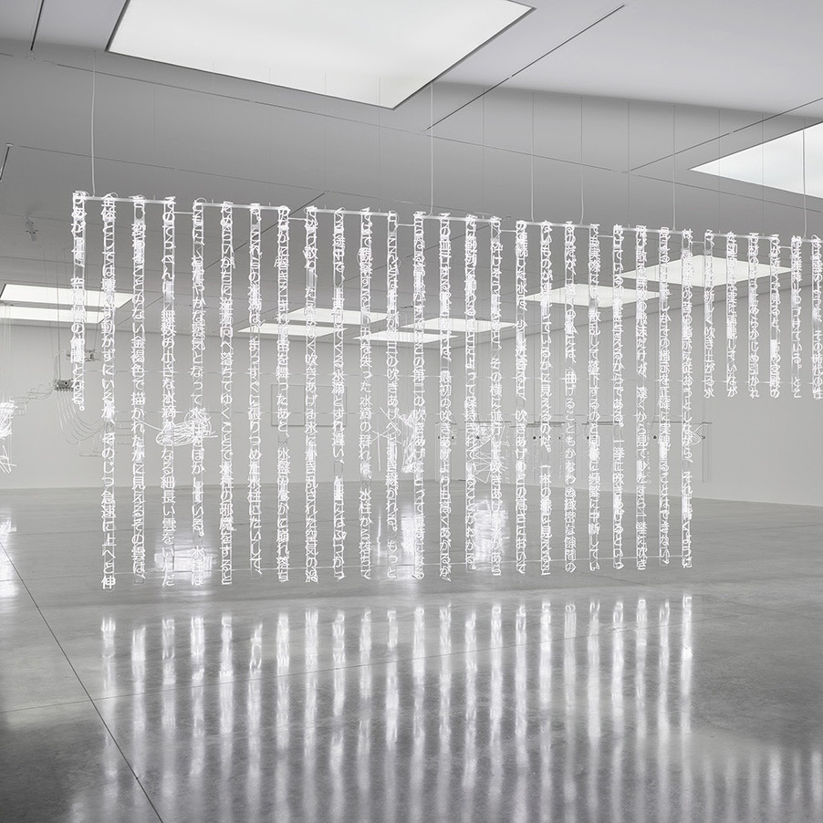2018年に同会場で開催された個展の第2章と位置づけられる本展。床面から天井まで達する光の柱作品に加え、クリスタルガラス製のフルートが自動演奏される立体作品と、マルセル・プルーストの『失われた時を求めて』の日本語訳の一部をもとにした大型ネオン作品が展示される予定だ。