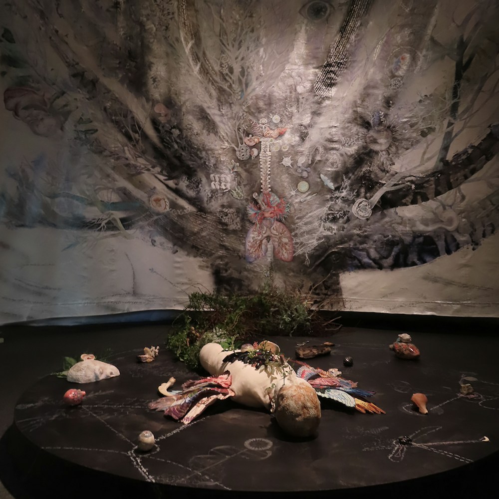 大小島真木 胎樹 Fetus tree 2020 アクリル、ラッカースプレー、マーカー・綿 368×546cm 2020年の練馬区立美術館での展示風景
