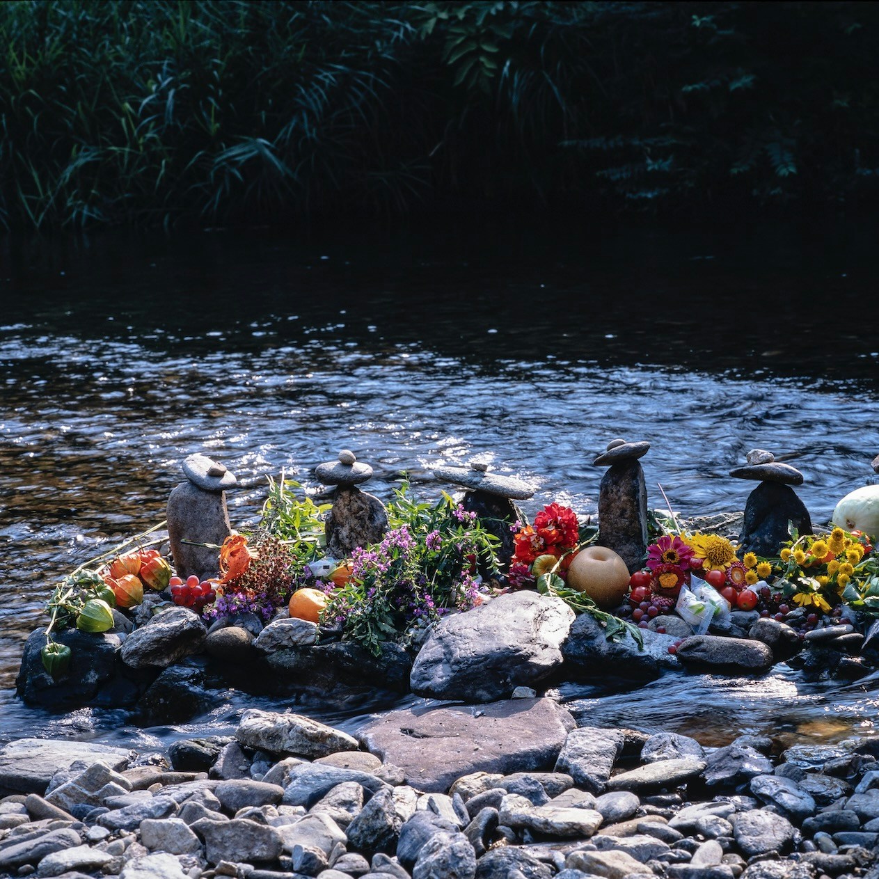 展覧会は6章構成。第1章「はじまりの場所」は、水源地でもある原生の森の地表からにじみでる水、沢、渓流などを被写体に、産卵のために渓流を遡上するビワマス、渓谷の落ち葉の中に佇むカモシカの骨、お盆の時期に先祖を供養するためにおこなわれる「おしょらいさん」など、水と土の匂いのなかの循環をとらえる。