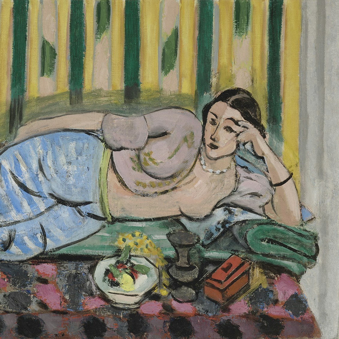 次のセクションでは、マティスにとって創造の現場であると同時に、絵画の重要な主題のひとつでもある「アトリエ」に注目。アトリエ内の女性モデルを描いた絵画や彫刻のほか、絵画にも頻繁に描かれるモチーフのために収集したオブジェや、米田が話す「マティスの画集を開けばどこにでも載っているような」絵画《ロカイユ様式の肘掛け椅子》(1946)とマティスが所有していた実際の椅子も出品される。