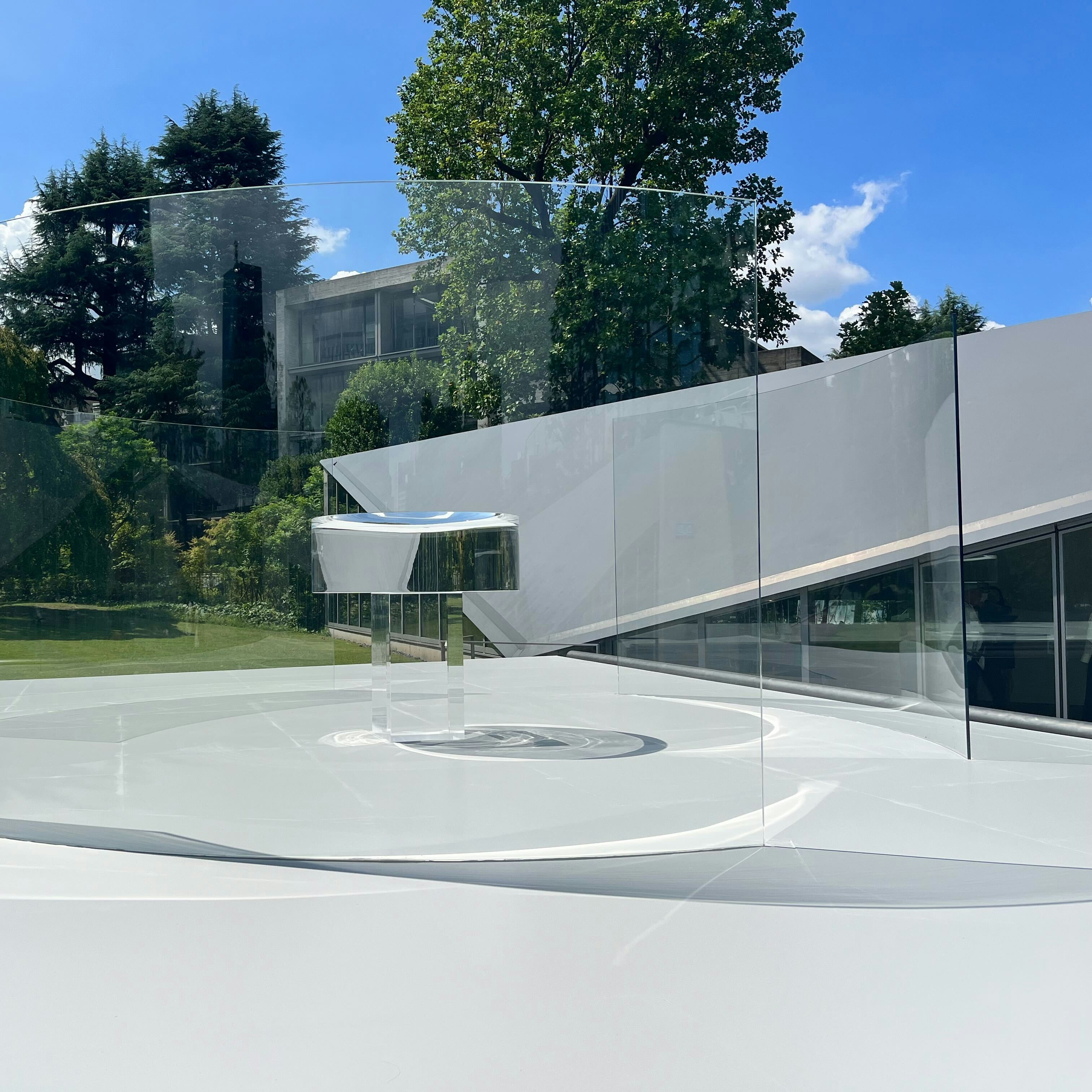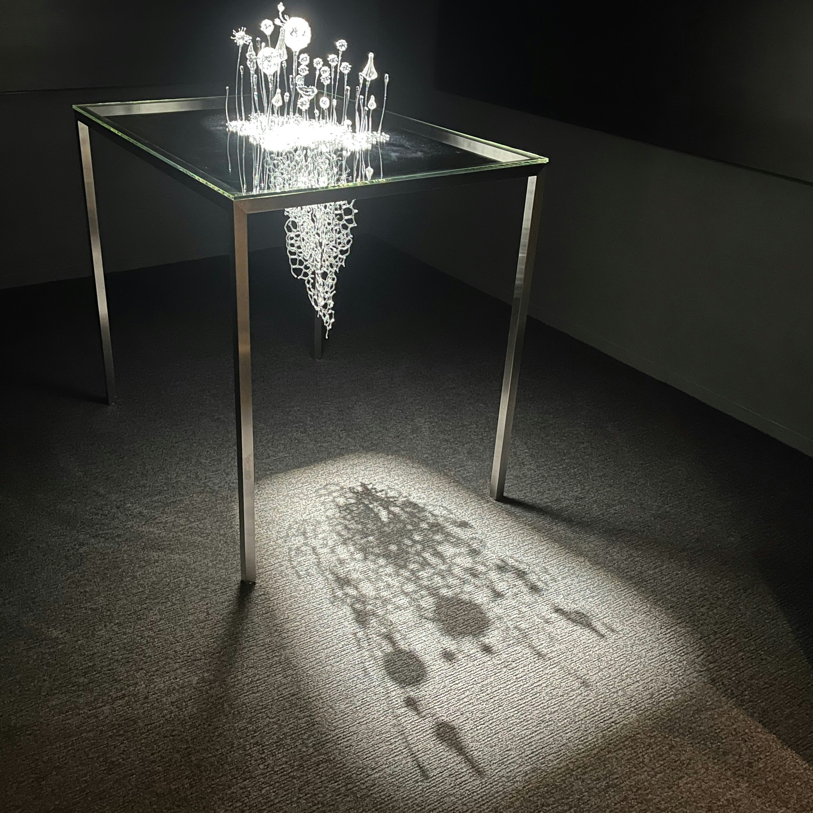 本展では、吉岡による、炎から放たれる「光」に着目したふたつの新作が初めて披露。ひとつは、透明のトーチで炎が空中に浮遊するように設計された《ガラスのトーチ》(2022)。もうひとつは、屋外に展示されている、同じく点火をすると炎が浮遊するように見える《ガラスの炬火台》(2022)だ。いずれも美しい造形を持ちながらも、炎そのものを際立たせるためのデザインとなっている。